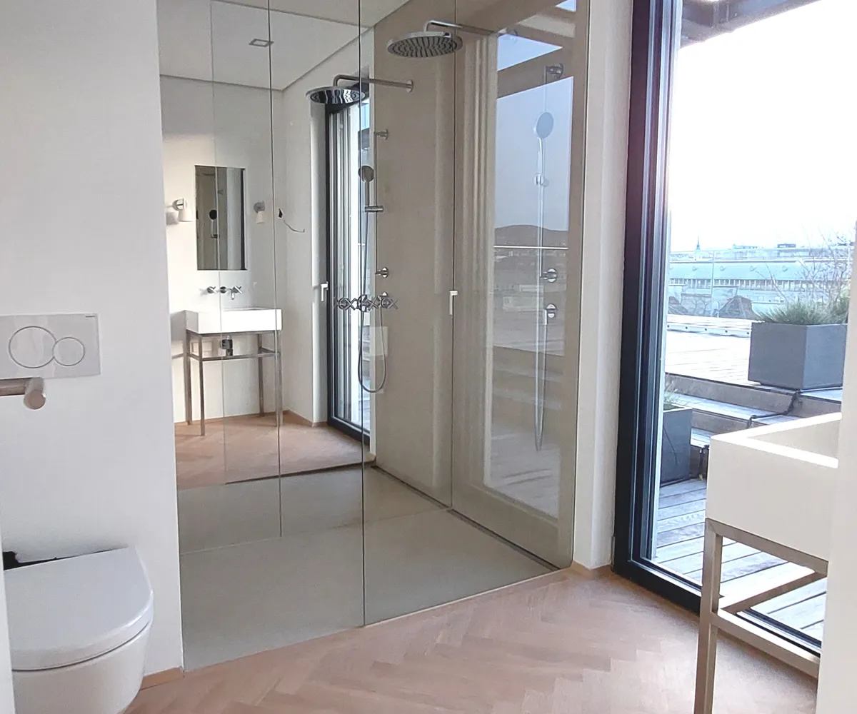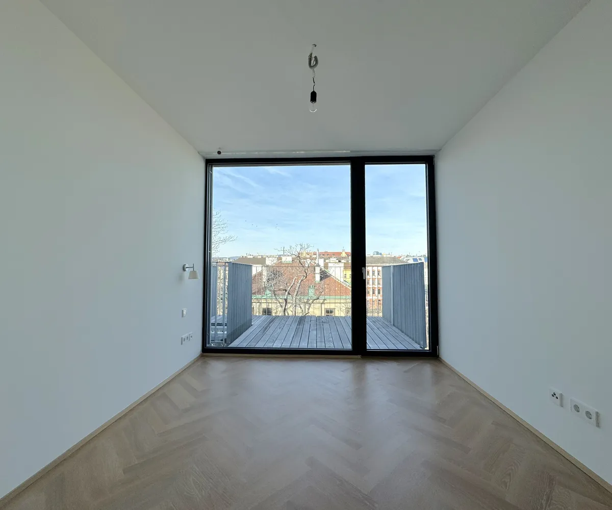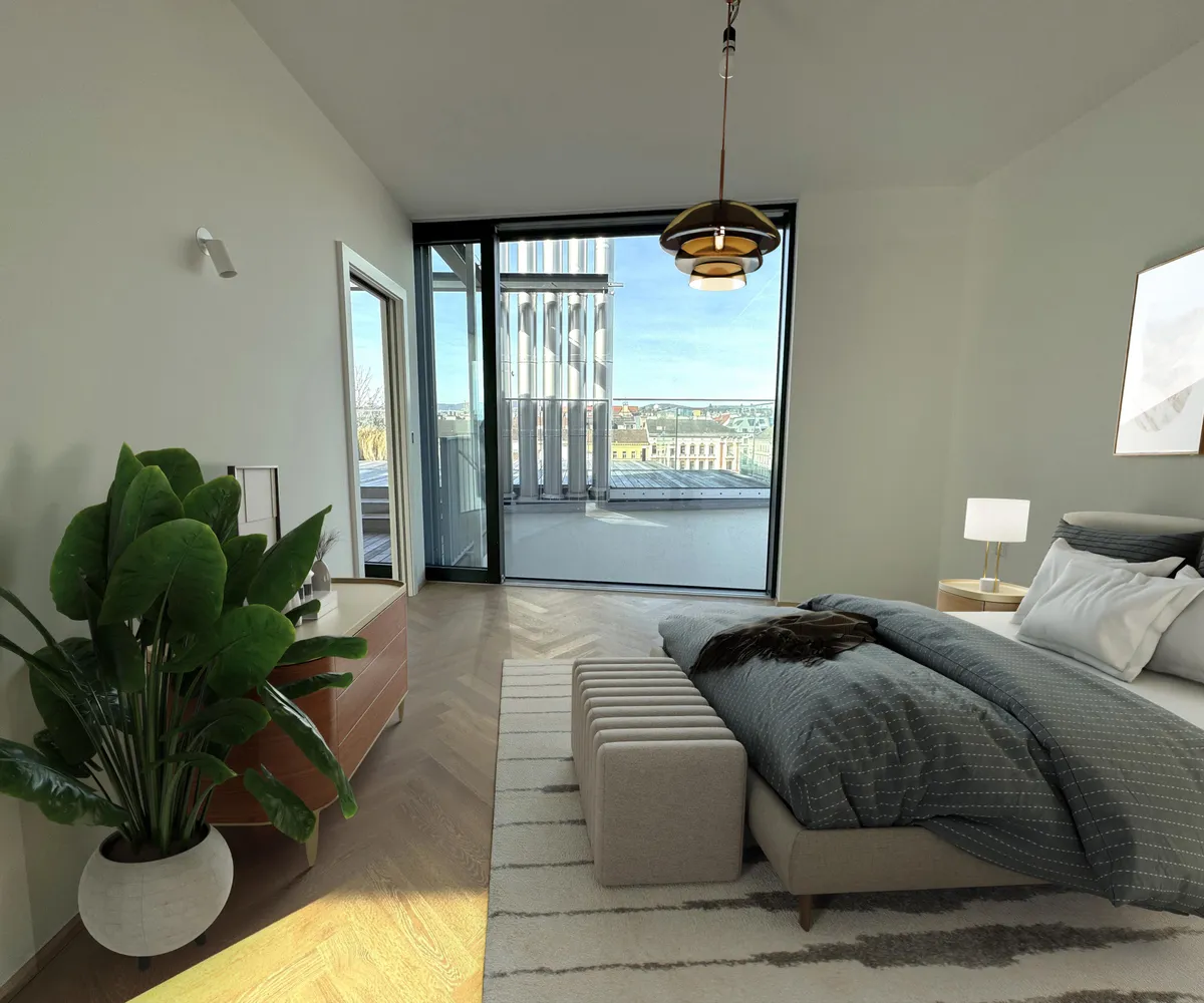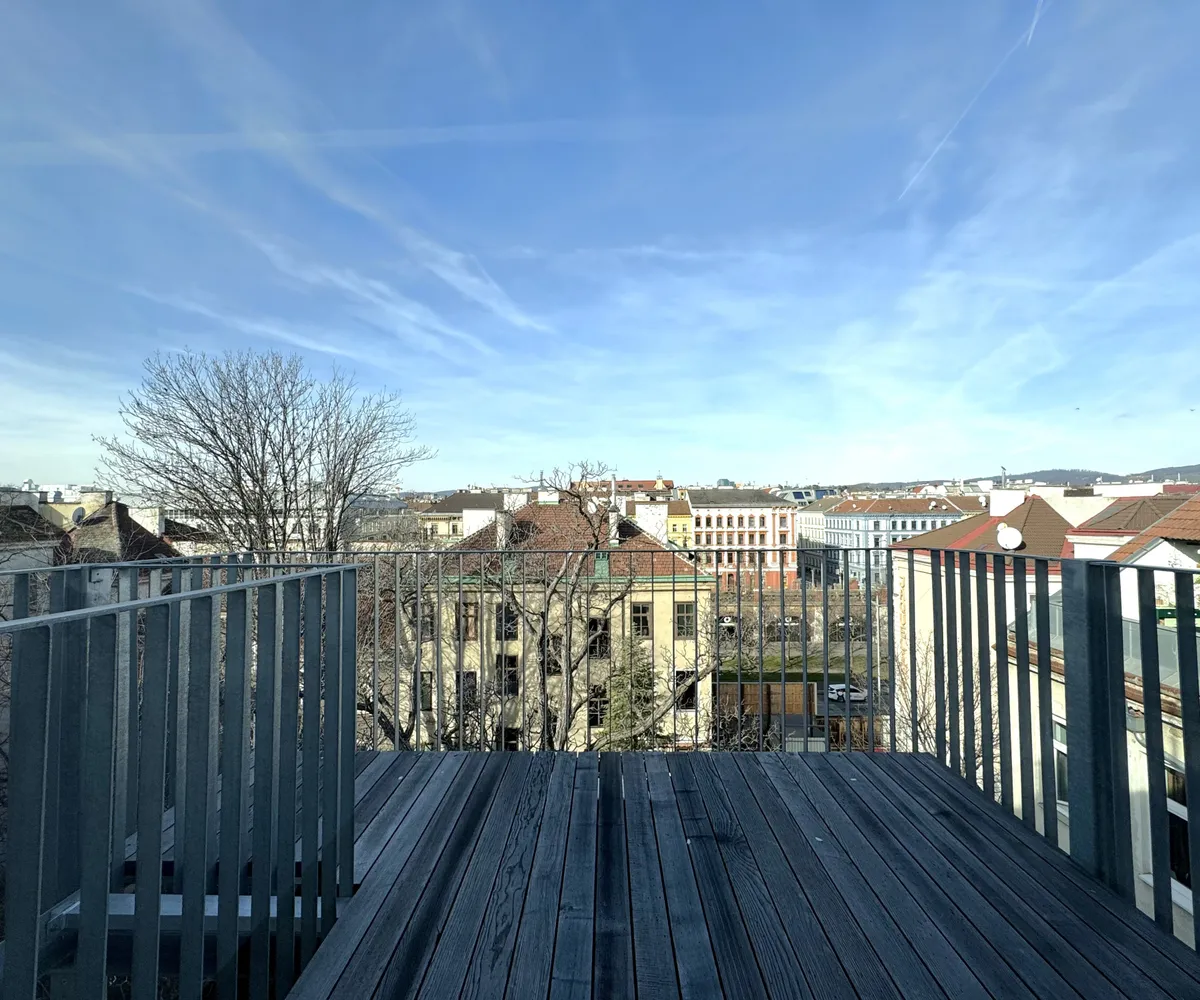 Ein besonderes Highlight: Die über 60 m² große, sonnige Terrasse. Großflächige Hebe-Schiebetüren verbinden Innen und Außen fließend und machen diese Terrasse zum spektakulären zweiten Wohnzimmer. Ob Frühstück mit Blick auf die erwachende Stadt oder Sundowner mit Freunden – dieser Weitblick bis zum Kahlenberg ist pure Lebensqualität.