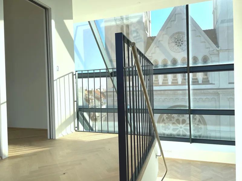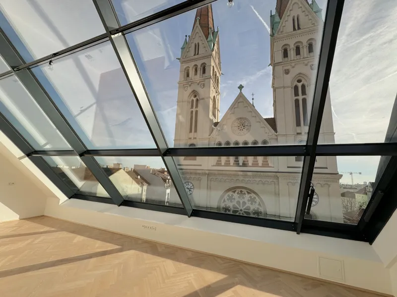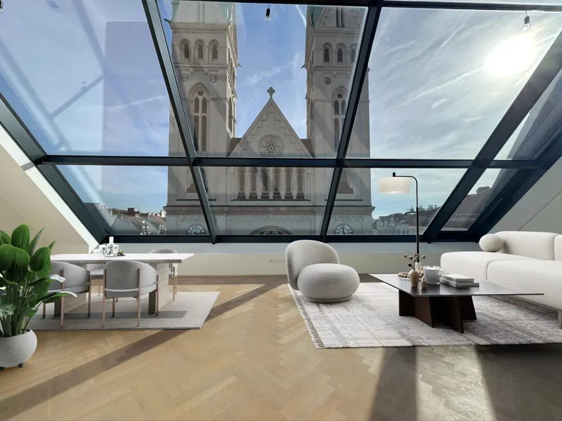 Bereits beim Betreten der unteren Wohnebene spüren Sie: Diese Wohnung ist etwas Besonderes. Die großzügige, offen gestaltete Wohnküche bildet das Herzstück dieser Etage – ein Ort, der zum Verweilen, Kochen, Lachen und Zusammensein einlädt. Riesige Fensterflächen öffnen den Raum zur Stadt hin und lassen Tageslicht in jeder Nuance einströmen. Der Blick auf die majestätische Canisiuskirche ist dabei ein tägliches Highlight – besonders am Abend, wenn die Lichter Wiens langsam erwachen.