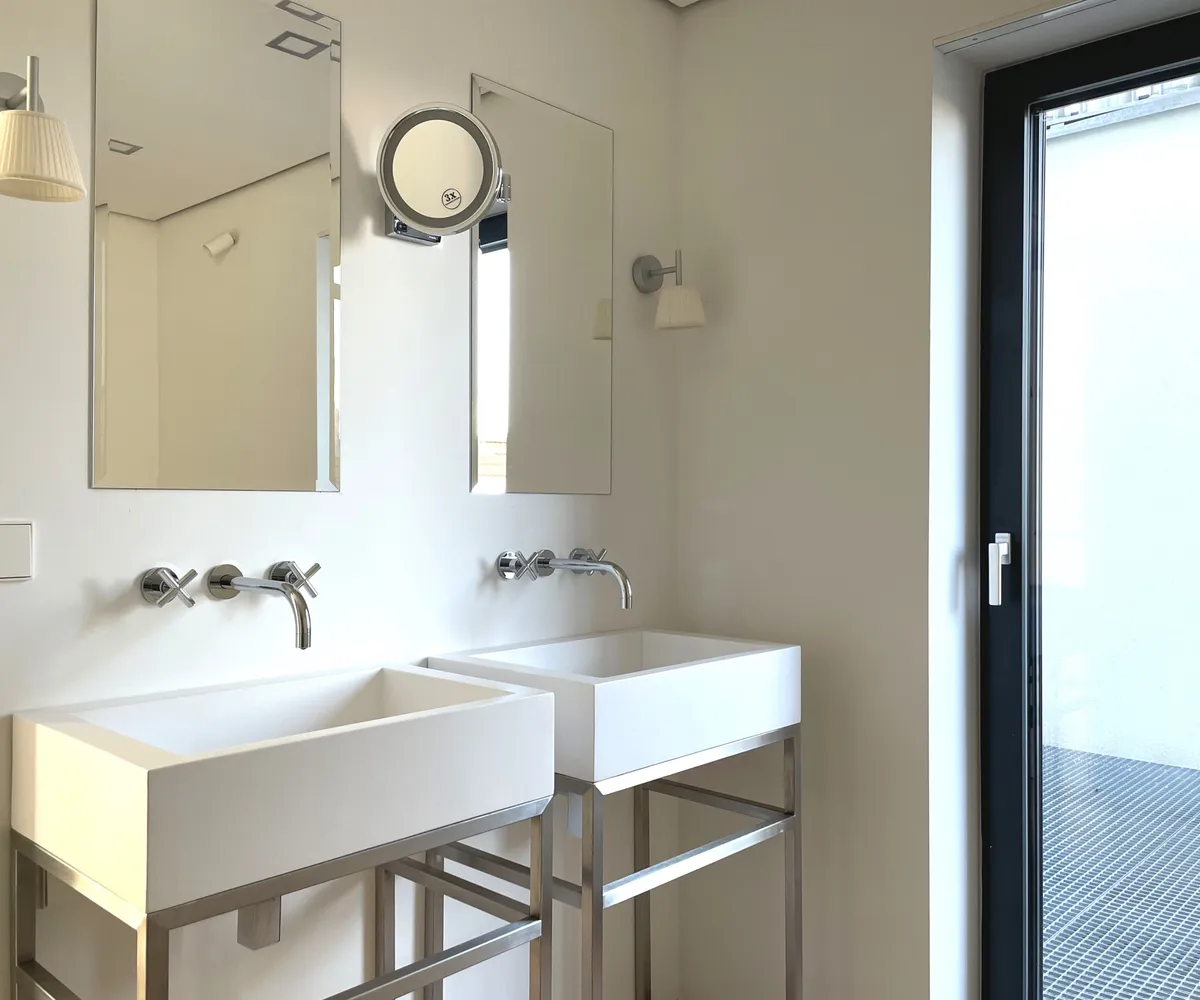 Über eine stilvolle Treppe erreichen Sie das Obergeschoss, wo sich ein weiteres exklusives Schlafzimmer mit angeschlossenem Bad befindet – ausgestattet mit Dusche und WC. Hier genießen Sie maximale Privatsphäre – ideal als Schlafzimmer oder als ruhiger Homeoffice-Bereich mit einem weiteren Badezimmer.