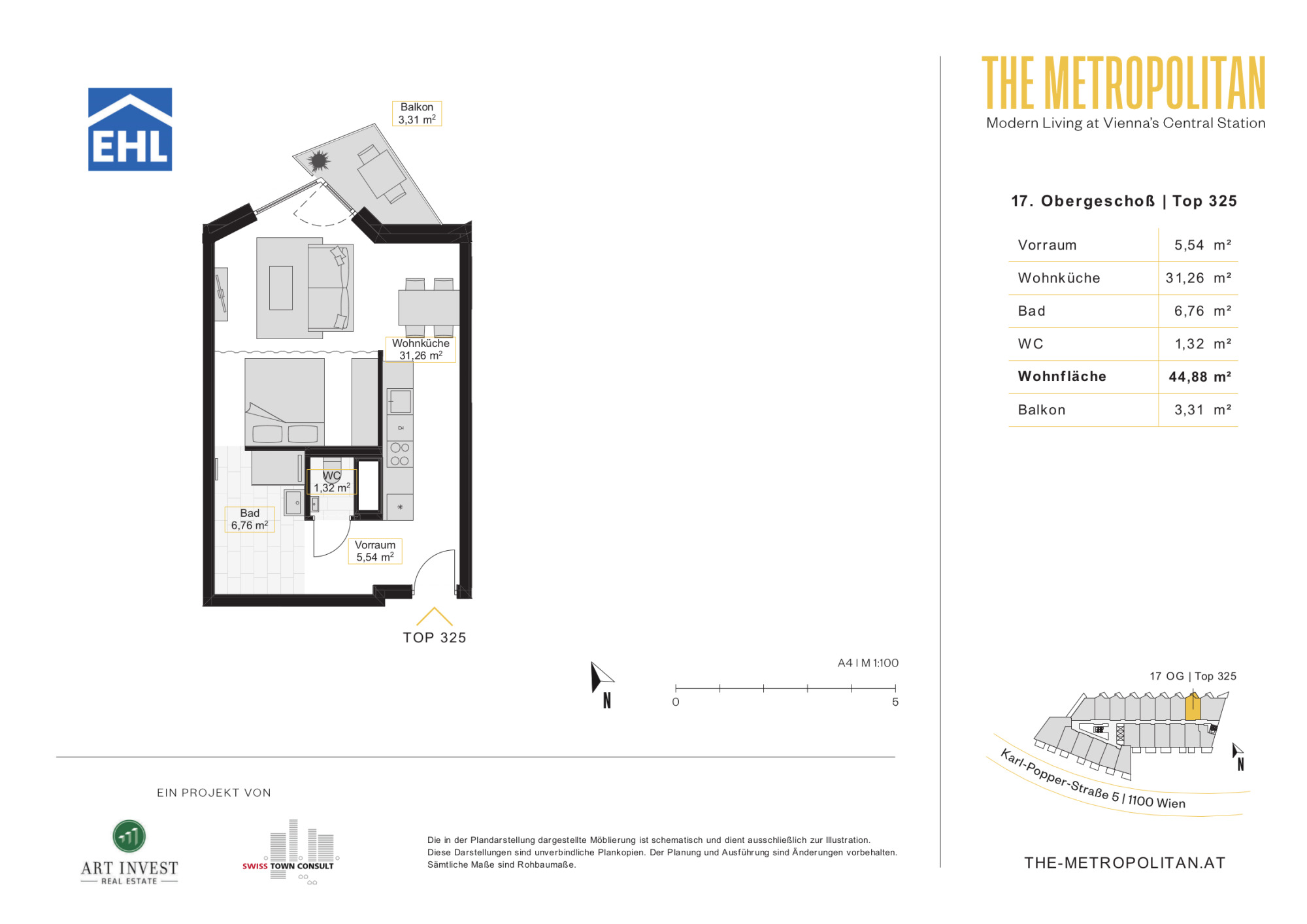 Das moderne Wohnbauprojekt „METROPOLITAN – Modern Living“ befindet sich im aufstrebenden und lebendigen Sonnwendviertel, nur wenige Gehminuten vom neu errichteten Hauptbahnhof entfernt. Die Lage bietet eine hervorragende Infrastruktur mit zahlreichen Einkaufsmöglichkeiten, Restaurants und Cafés in der Umgebung. Besonders hervorzuheben ist die Nähe zum Helmut-Zilk-Park, der Erholung und Freizeitspaß für die ganze Familie bietet.