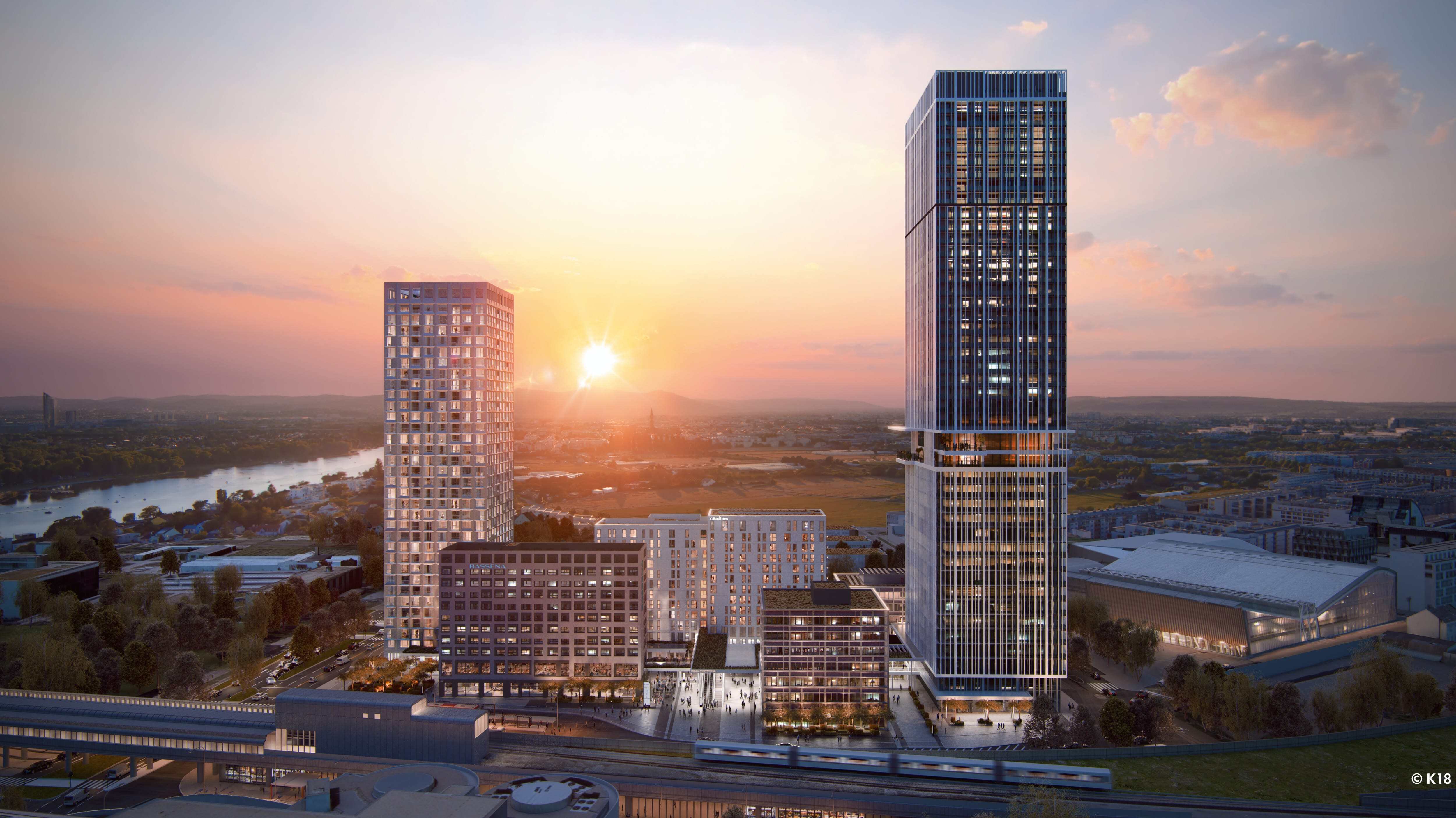 Direkt an der U1-Station Kagran und gegenüber dem Donau Zentrum entsteht ein rund 155 Meter hoher Wohnturm mit 45 Etagen – ein neues Landmark für modernes Wohnen in Wien.