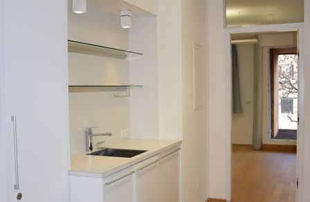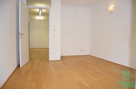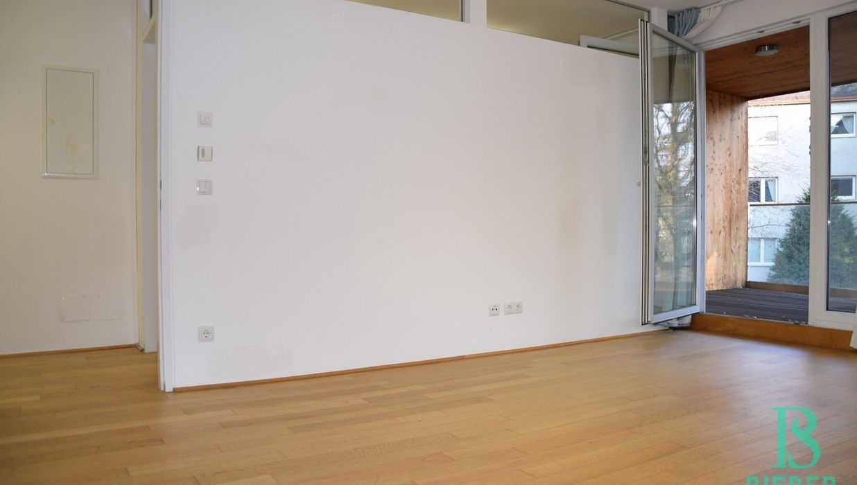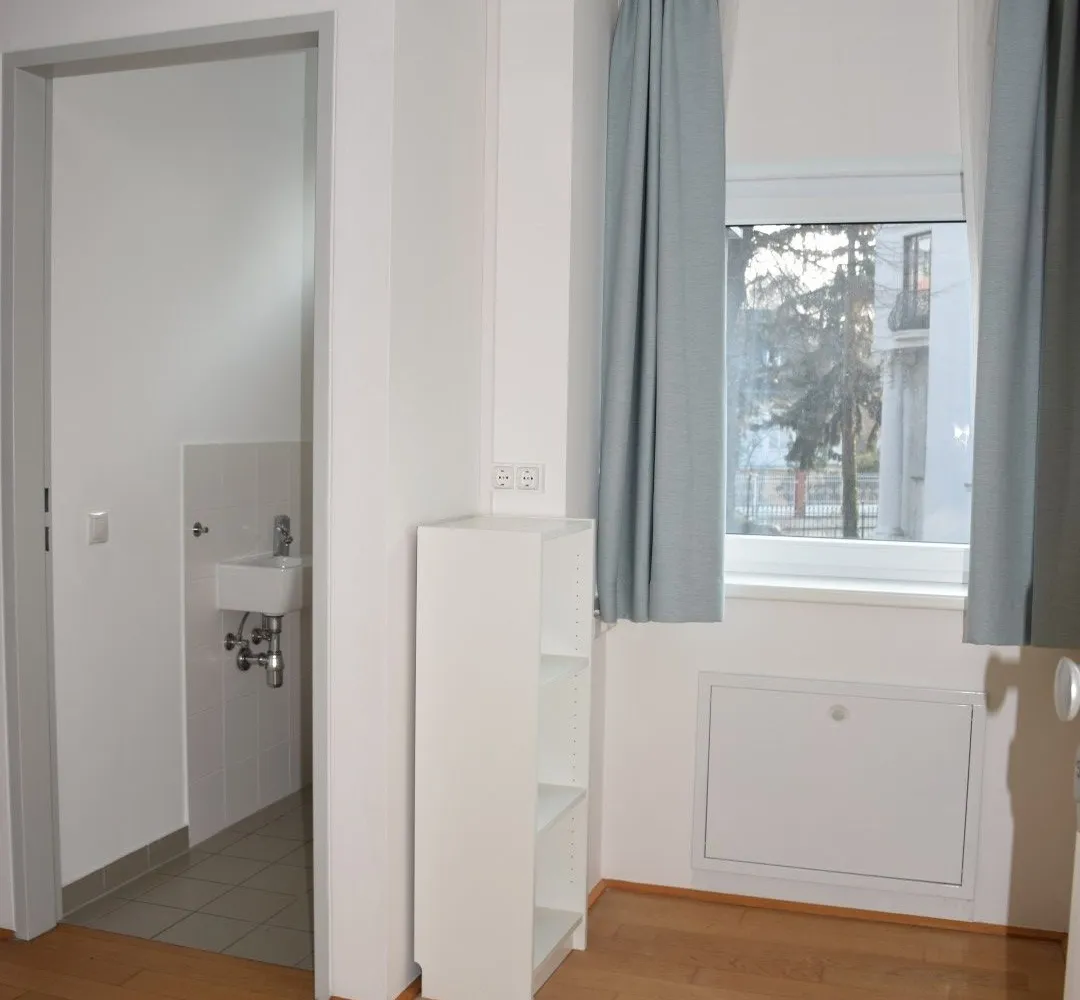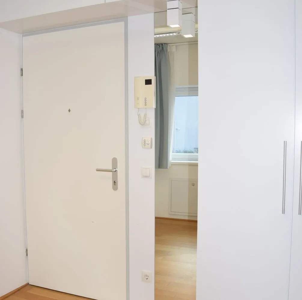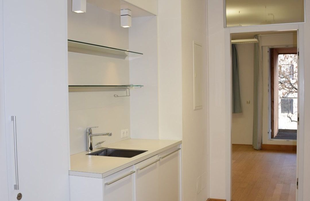 Über den Vorraum, in dem sich die eingebaute, Pantry-Küche befindet, gelangt man in den sonnigen Wohnraum mit Ausgang auf die Loggia, des Weiteren in ein Zimmer mit Ausgang auf die Loggia, in das Bad mit Dusche und Waschtisch und in das separate WC mit Handwaschbecken.