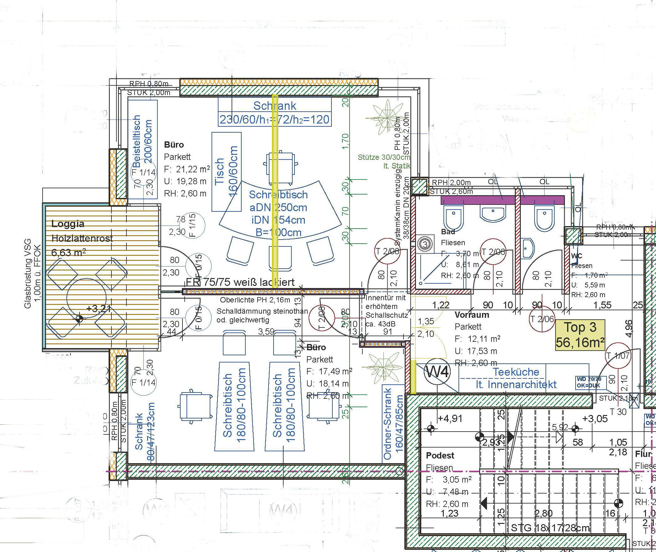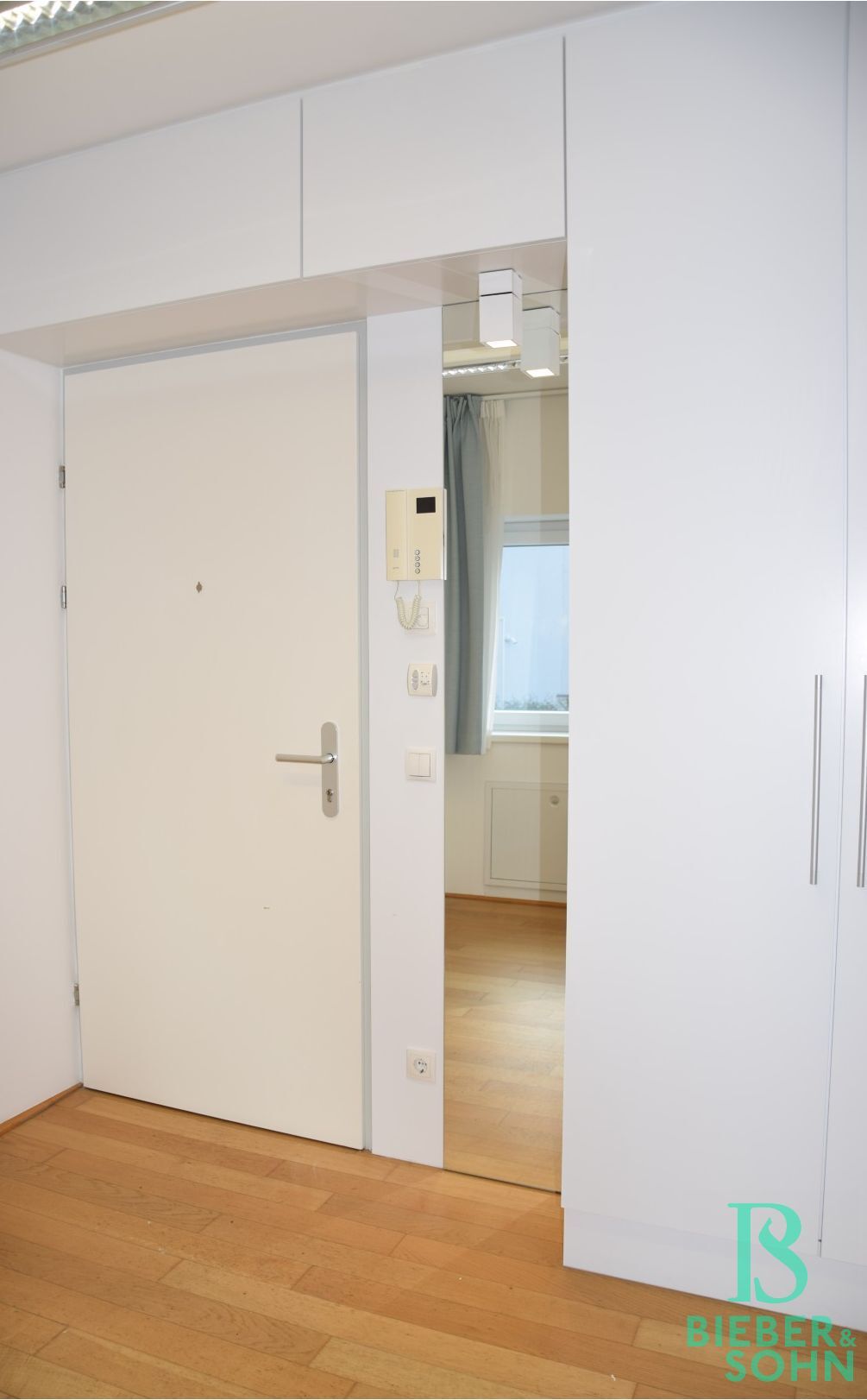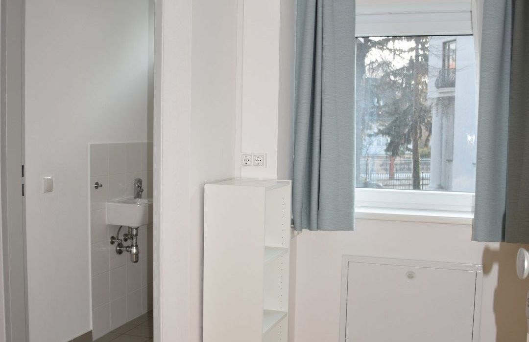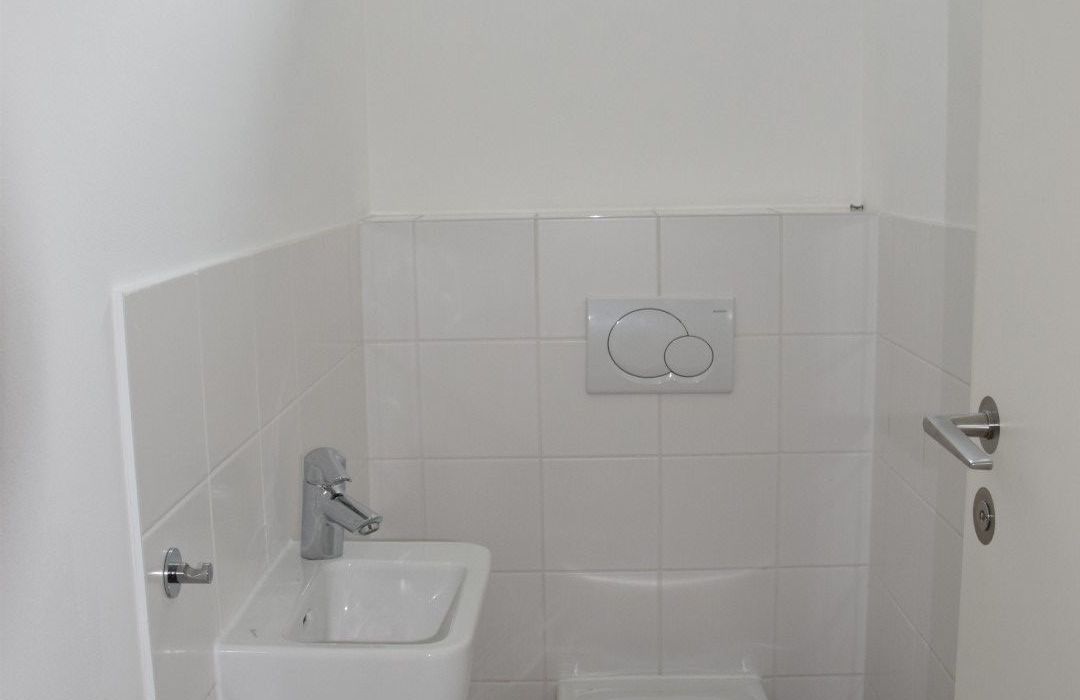 Über den Vorraum, in dem sich die eingebaute, Pantry-Küche befindet, gelangt man in den sonnigen Wohnraum mit Ausgang auf die Loggia, des Weiteren in ein Zimmer mit Ausgang auf die Loggia, in das Bad mit Dusche und Waschtisch und in das separate WC mit Handwaschbecken.