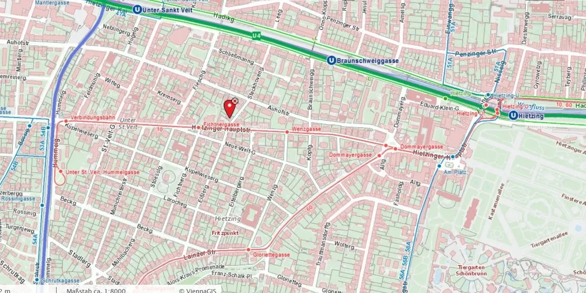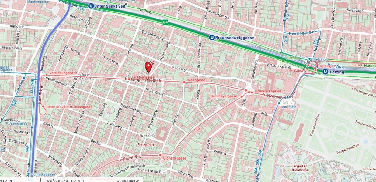 Die öffentliche Verkehrsanbindung ist ausgezeichnet, in wenigen Gehminuten ist die U4 Station Braunschweiggasse zu erreichen, die Strassenbahnlinie 10 vor der Türe. Die Geschäfte des täglichen Bedarfs sind ebenfalls fußläufig erreichbar.