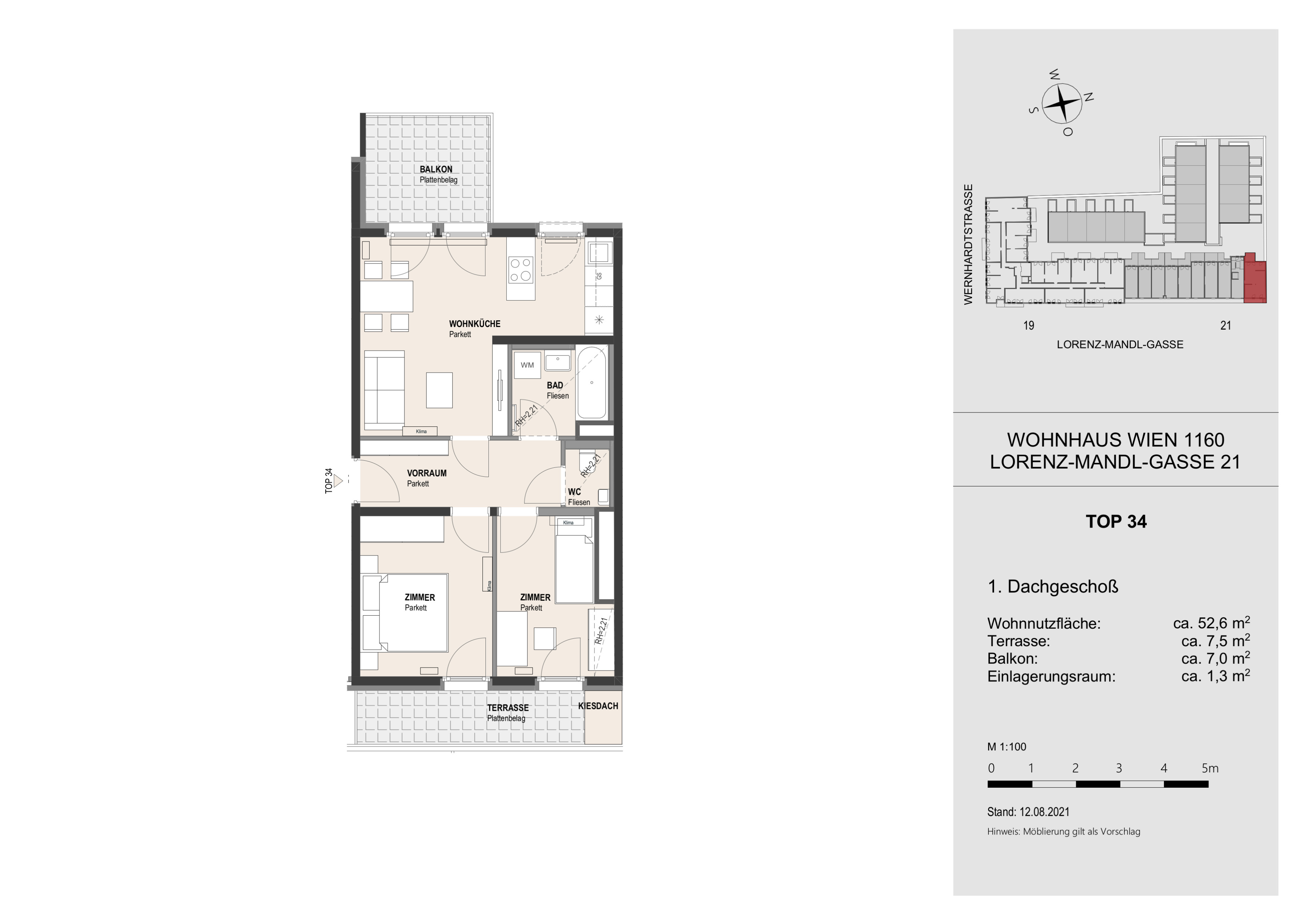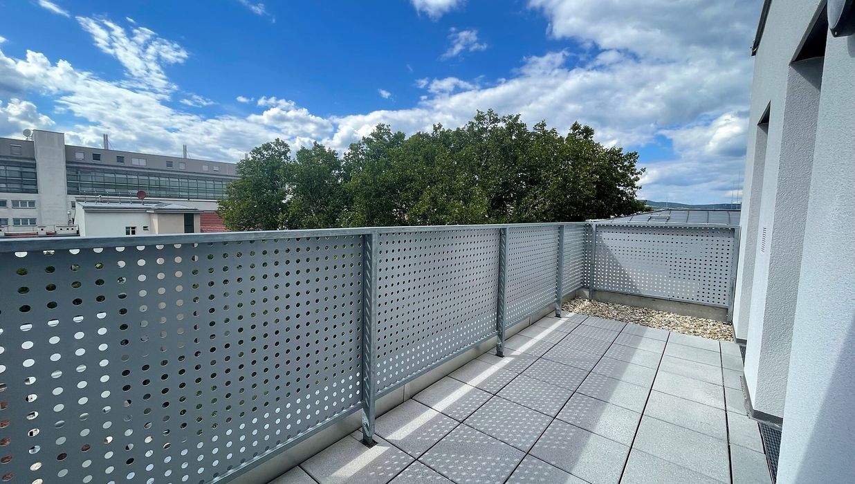 Die Wohnung befindet sich im 1. Dachgeschoss und verfügt über einen großzügigen Wohnraum mit voll ausgestatteter Küche, zwei Schlafzimmer, ein Badezimmer mit Badewanne, WC und Waschmaschinenanschluss sowie einen Vorraum eine Terrasse und einen Balkon.