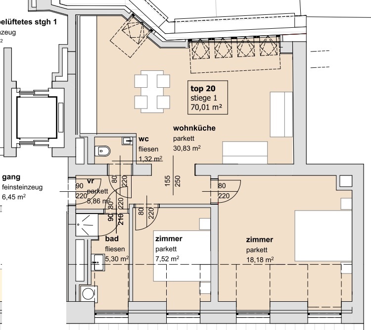 Die Wohnung befindet sich in der 6. Etage und gliedert sich in eine großzügige Wohnküche, zwei getrennt begehbare Schlafzimmer, ein Badezimmer mit Dusche und Waschmaschinenanschluss, einem separatem WC und einem Vorraum.
