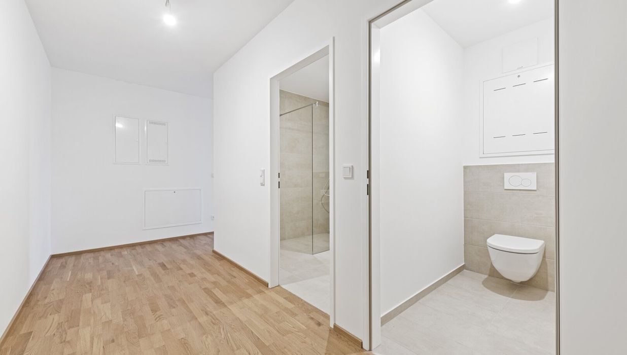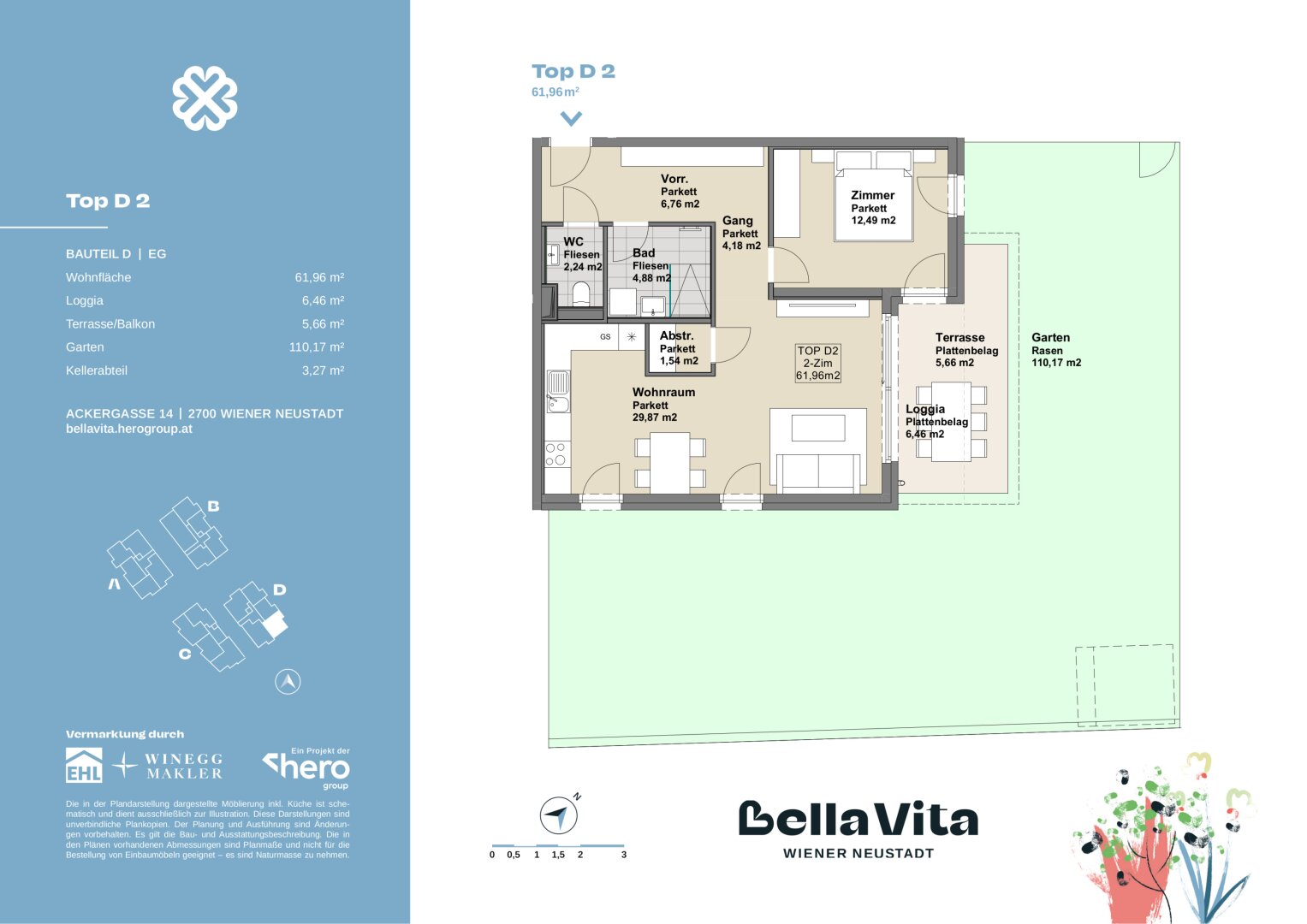 Fahrradabstellplätze, Kinderwagenraum, Spielplatz mit Pergola und Sitzmöglichkeiten sowie eine Tiefgarage vervollständigen das Angebot des durchdachten, modernen und nachhaltigen Projekts. Ein Tiefgaragenplatz ist zu erwerben (ab € 17.500,–).