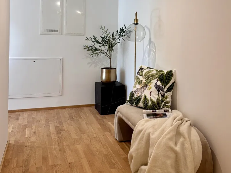 In Zukunft könnte Ihr Tag so starten: Sie blinzeln bereits beim Aufstehen durch die bodentiefen Fenster der Sonne entgegen, stellen Ihre Füße auf den angenehm natürlichen Holzboden und machen die erste Schritte in den Tag Richtung Badezimmer, wo Sie die mediterranen Fliesen gedanklich in den Süden reisen lassen. Jetzt fehlt nur noch der originale Espresso, den Sie in der geräumigen Wohnküche zubereiten und dessen Duft alle Sinne weckt. Nun aber raus ins Freie: die Hebe-Schiebetüre auf, den Geruch des frischen Tages einatmend und Sie wissen, wie bella Ihr Vita ist.