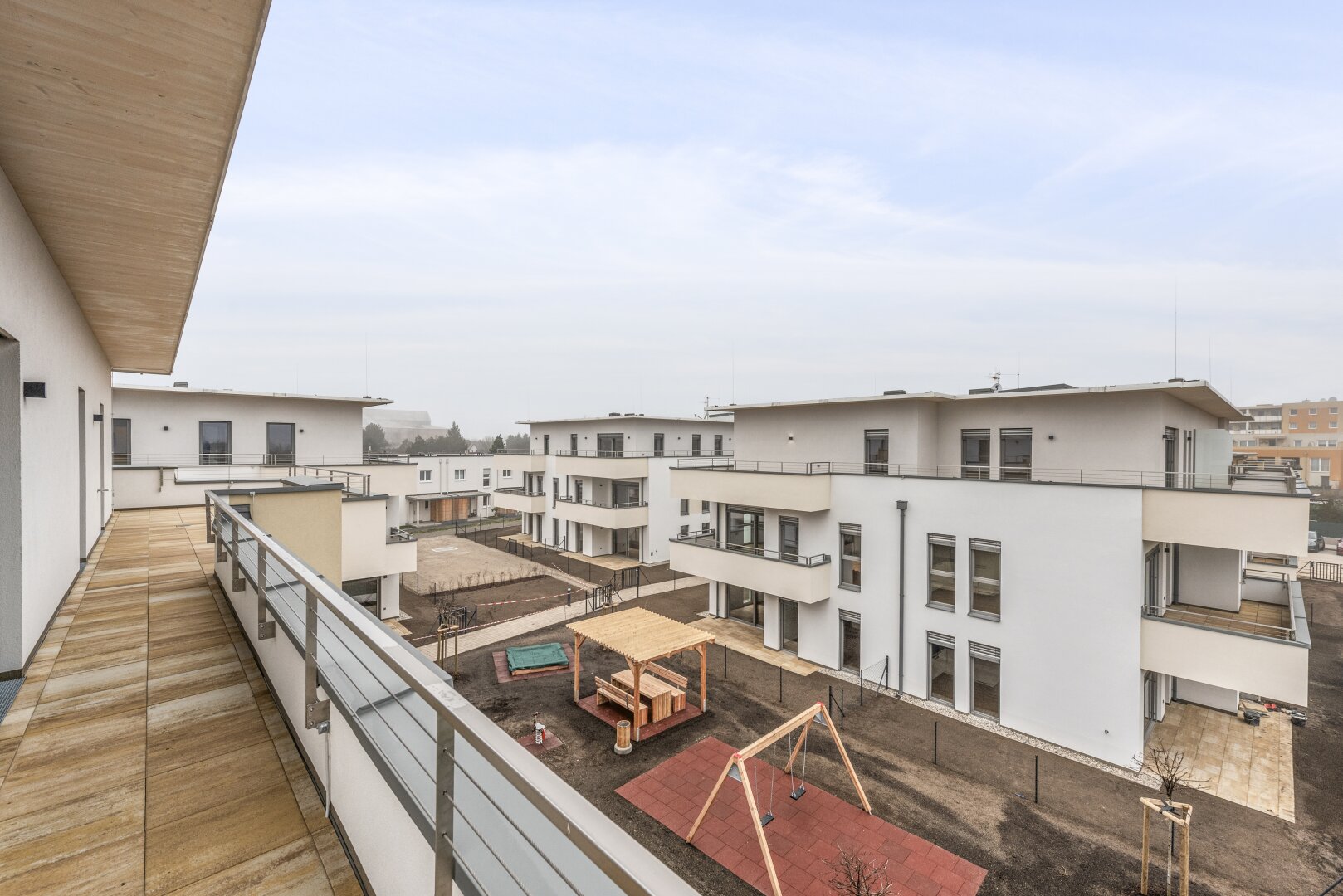 Fahrradabstellplätze, Kinderwagenraum, Spielplatz mit Pergola und Sitzmöglichkeiten sowie eine Tiefgarage vervollständigen das Angebot des durchdachten, modernen und nachhaltigen Projekts. Ein Tiefgaragenplatz ist zu erwerben (ab € 17.500,–).