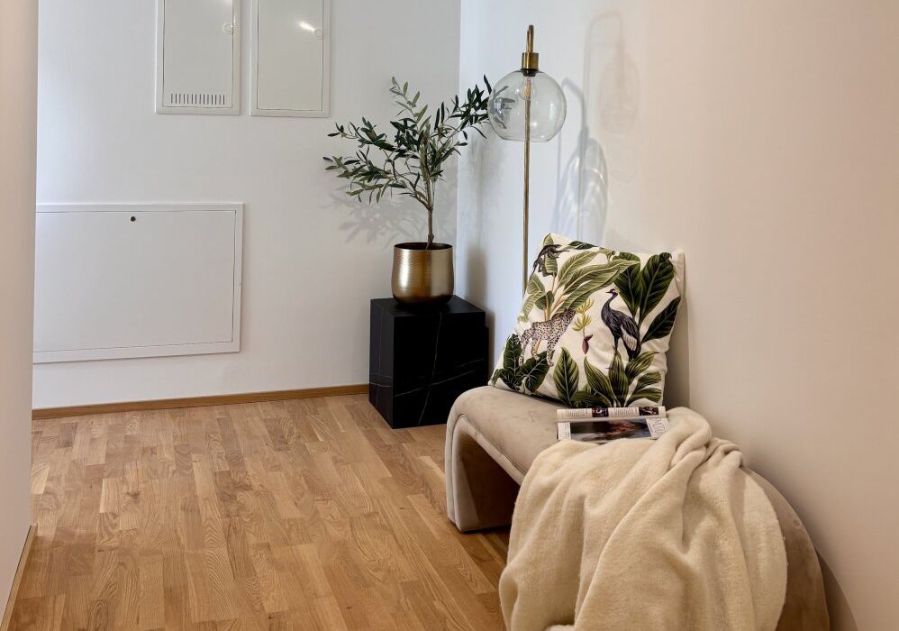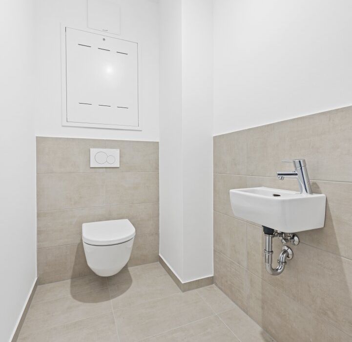 Fahrradabstellplätze, Kinderwagenraum, Spielplatz mit Pergola und Sitzmöglichkeiten sowie eine Tiefgarage vervollständigen das Angebot des durchdachten, modernen und nachhaltigen Projekts. Ein Tiefgaragenplatz ist zu erwerben (ab € 17.500,–).