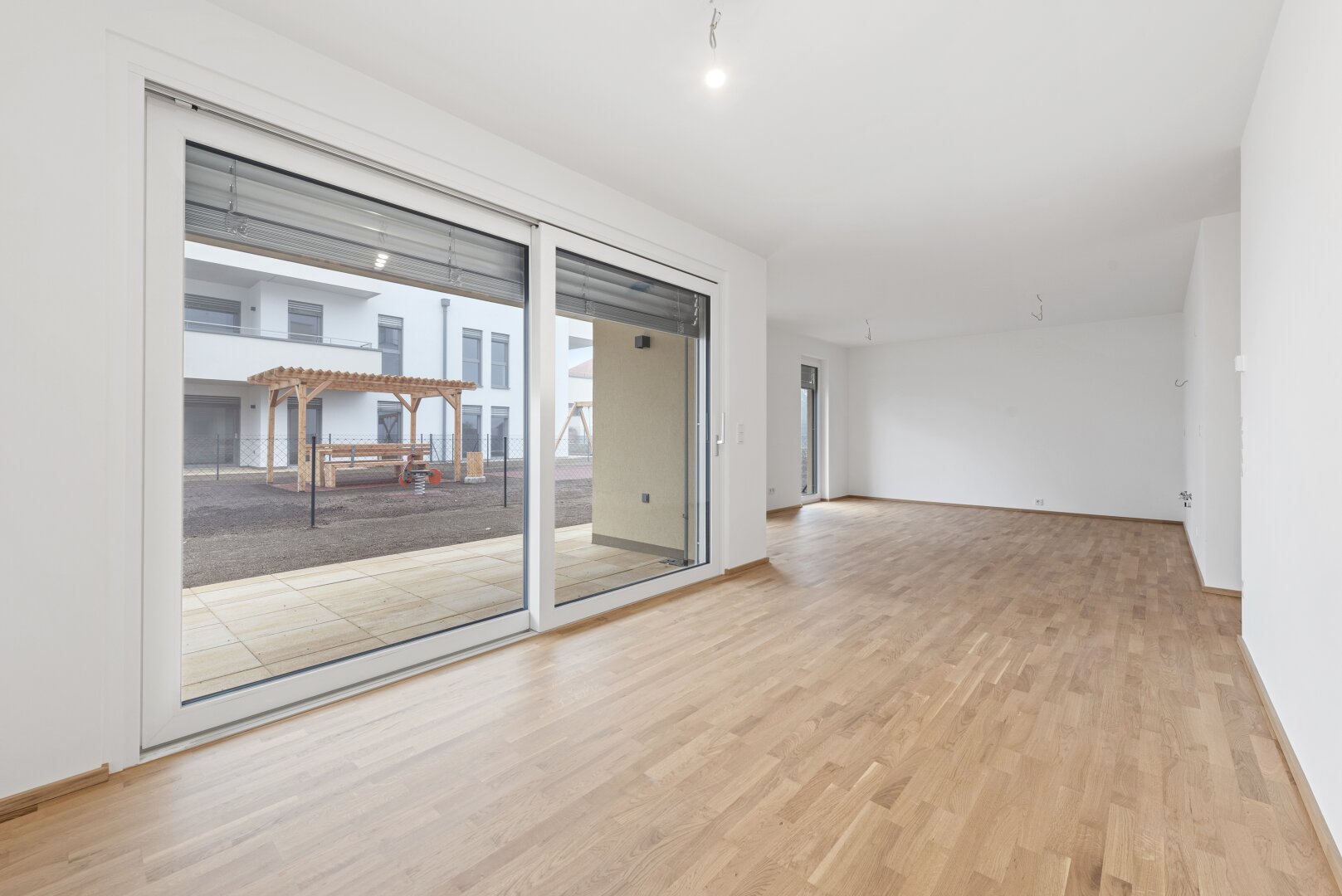 Fahrradabstellplätze, Kinderwagenraum, Spielplatz mit Pergola und Sitzmöglichkeiten sowie eine Tiefgarage vervollständigen das Angebot des durchdachten, modernen und nachhaltigen Projekts. Ein Tiefgaragenplatz ist zu erwerben (ab € 17.500,–).