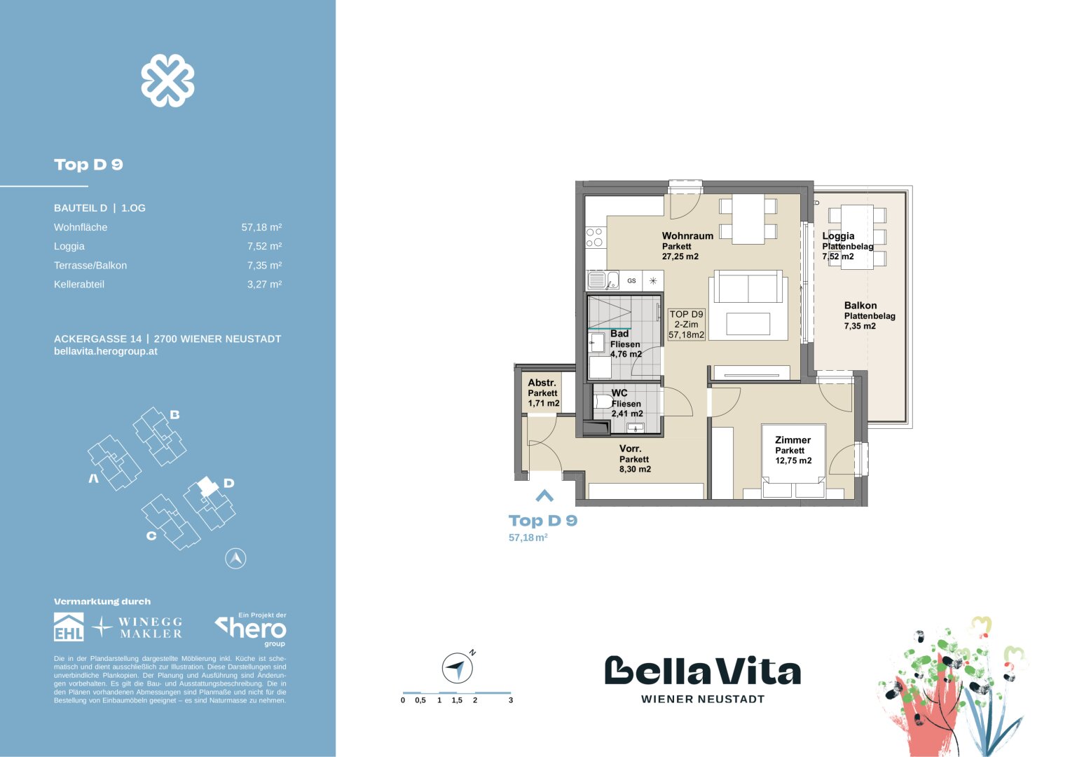 Fahrradabstellplätze, Kinderwagenraum, Spielplatz mit Pergola und Sitzmöglichkeiten sowie eine Tiefgarage vervollständigen das Angebot des durchdachten, modernen und nachhaltigen Projekts. Ein Tiefgaragenplatz ist zu erwerben (ab € 17.500,–).