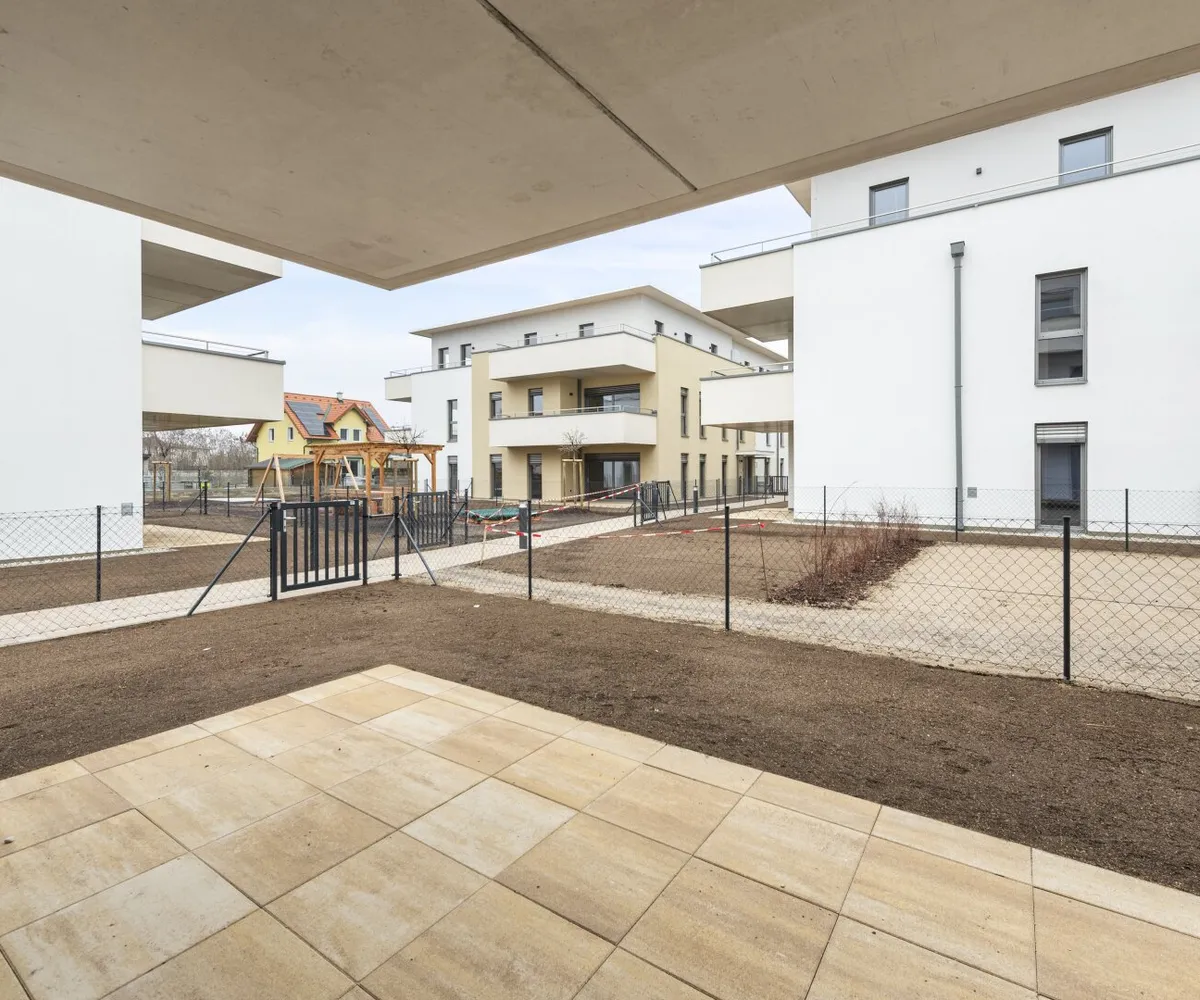Fahrradabstellplätze, Kinderwagenraum, Spielplatz mit Pergola und Sitzmöglichkeiten sowie eine Tiefgarage vervollständigen das Angebot des durchdachten, modernen und nachhaltigen Projekts. Ein Tiefgaragenplatz ist zu erwerben (ab € 17.500,–).