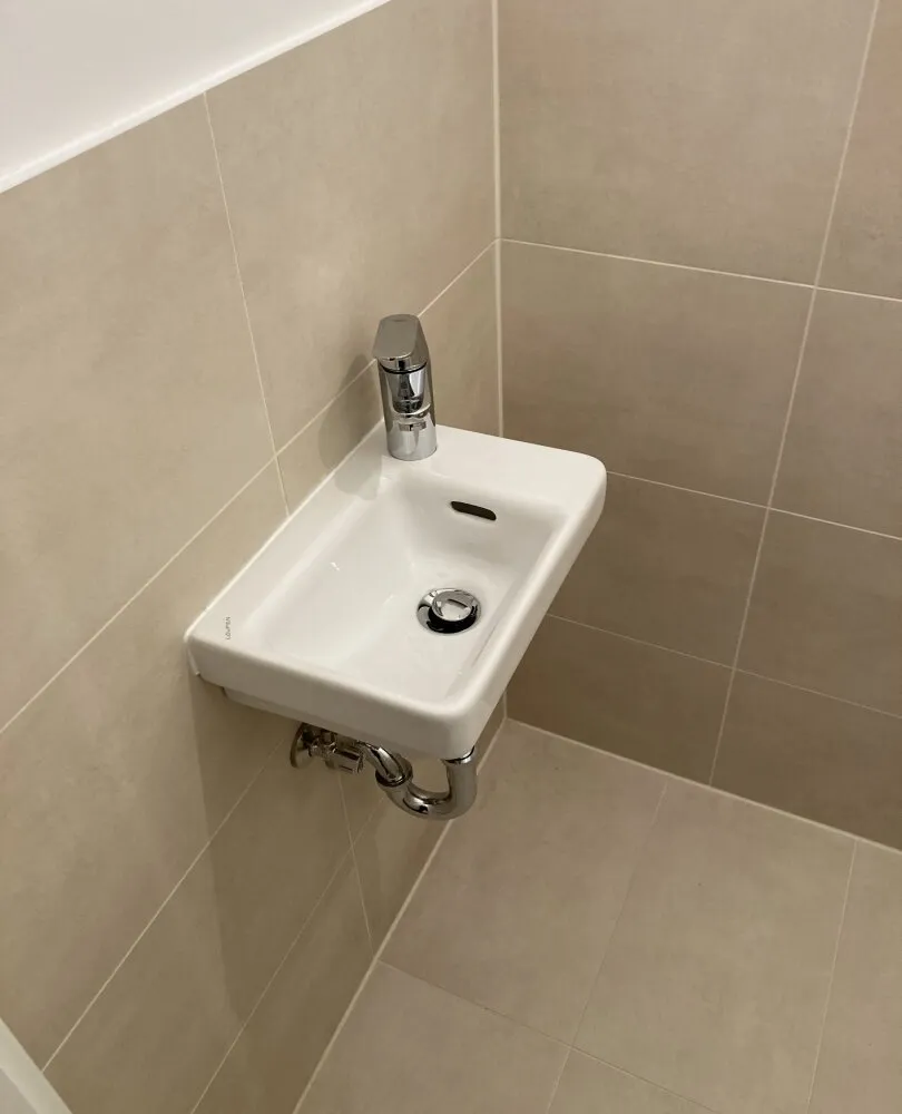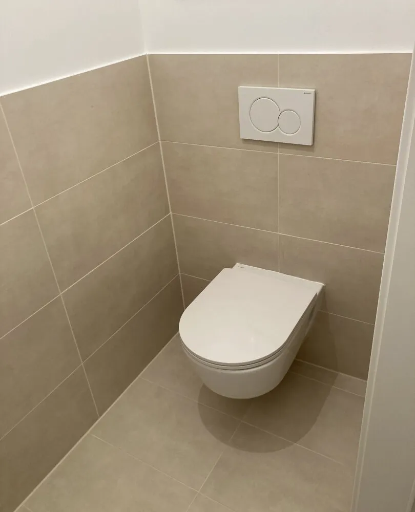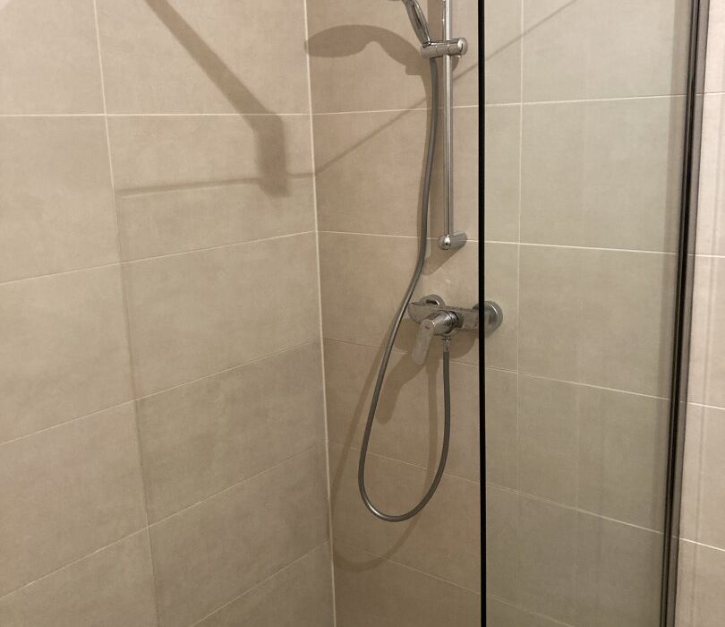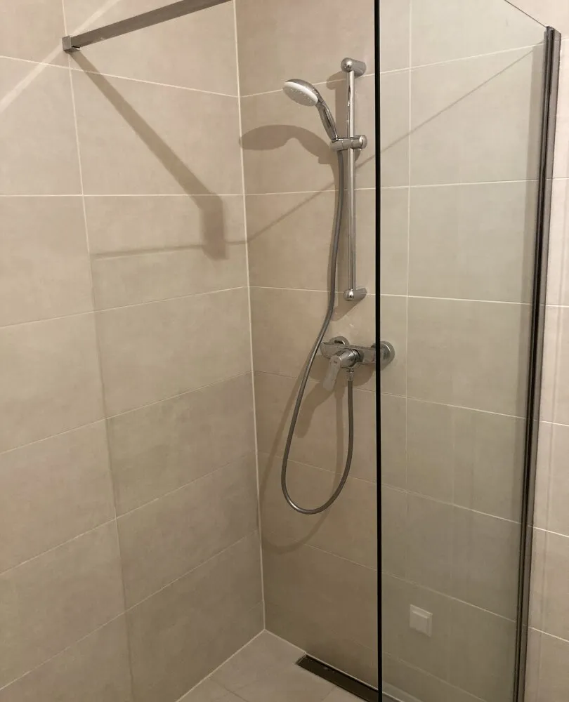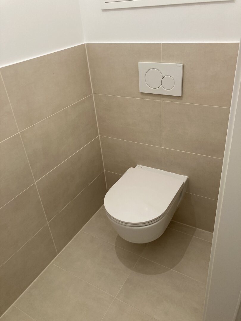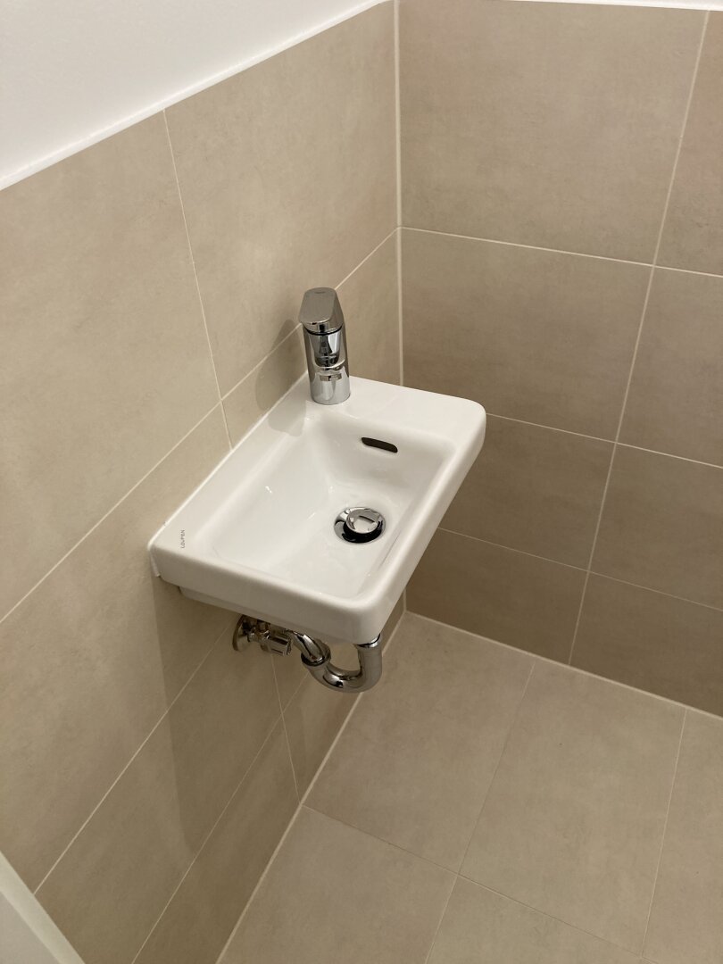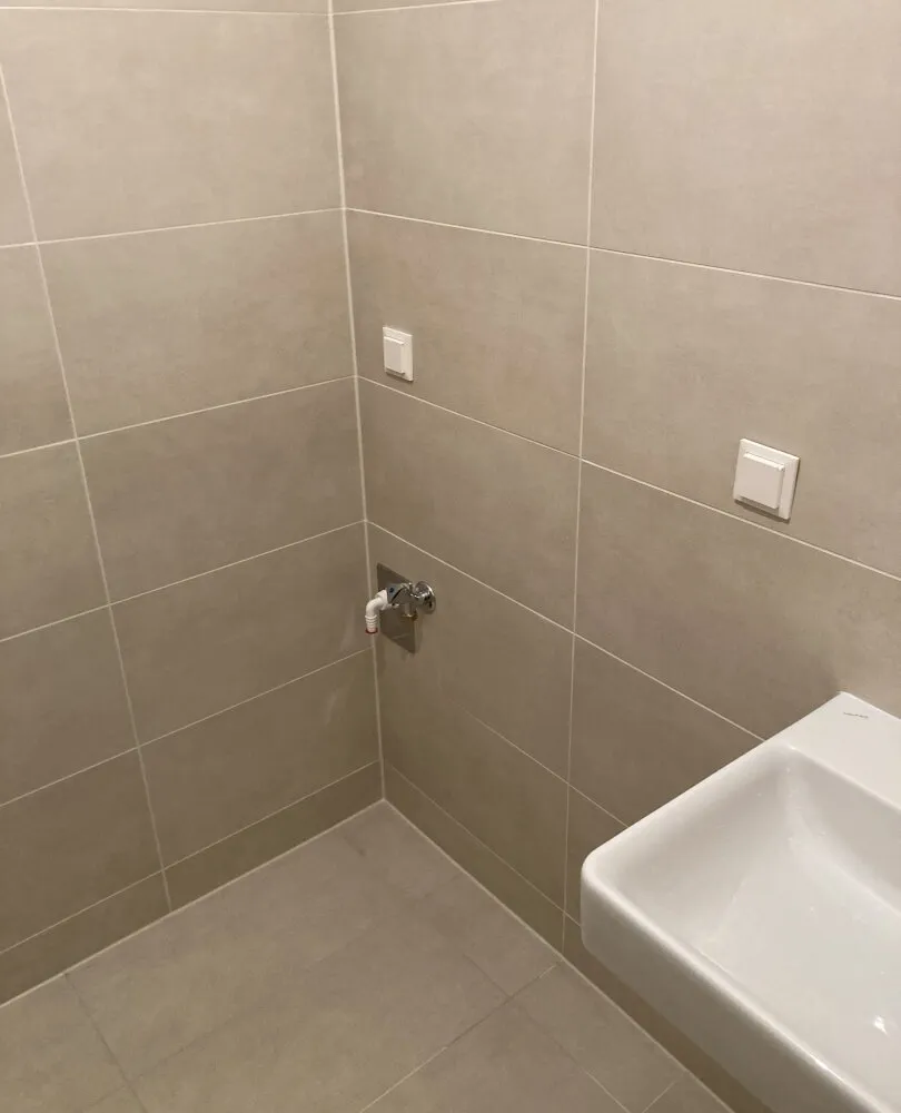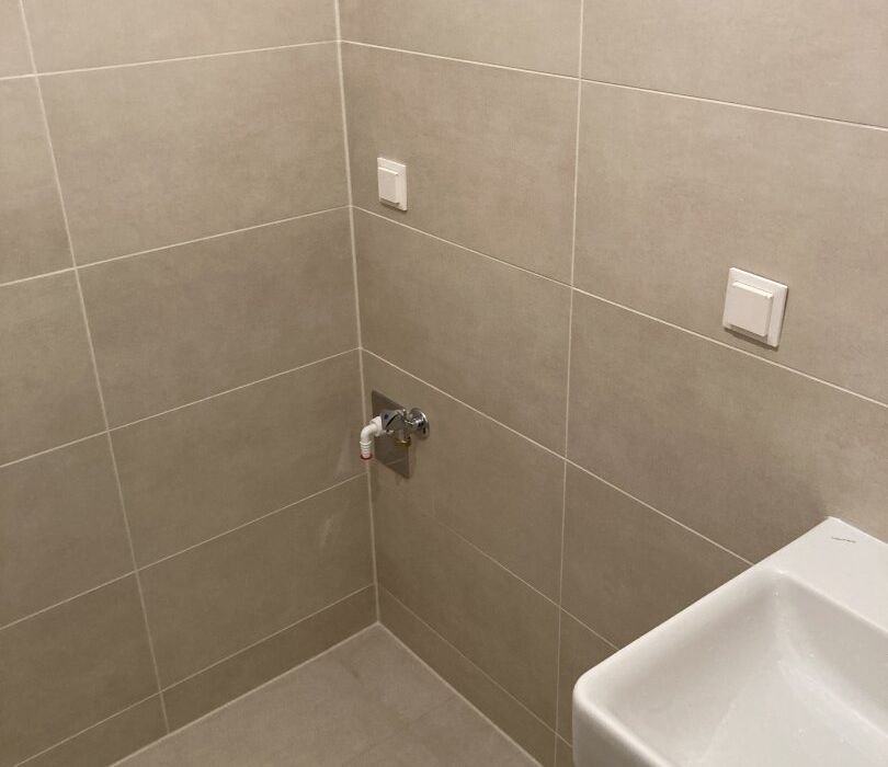 Modernes Badezimmer mit Dusche und Waschmaschinenanschluss