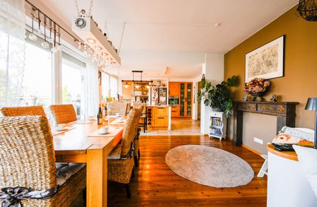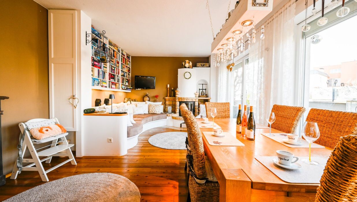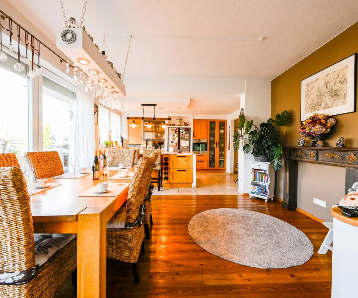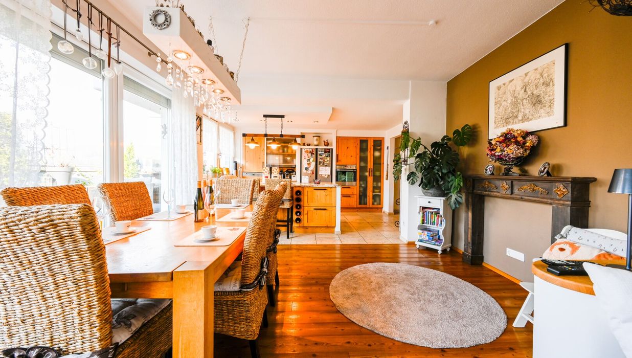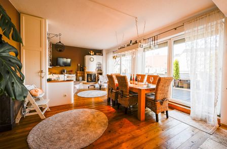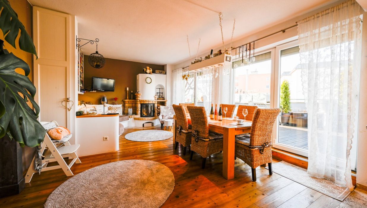 Der großzügige Wohn- und Essbereich bildet das Herzstück der Wohnung. Große Fensterflächen durchfluten die Räume mit Tageslicht und schaffen eine freundliche, offene Atmosphäre. Der direkte Zugang zur weitläufigen Terrasse verbindet Innen- und Außenbereich auf harmonische Weise – ideal für entspannte Stunden oder gesellige Abende. Der holzbeheizte Kamin sorgt für eine heimelige Atmosphäre in ihrem neuen Eigenheim.