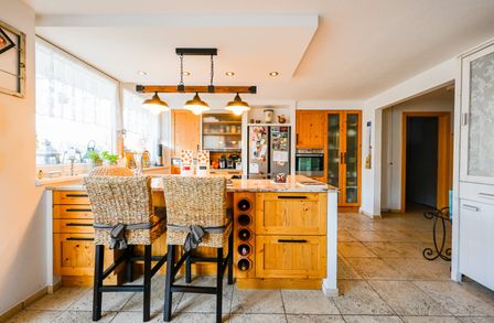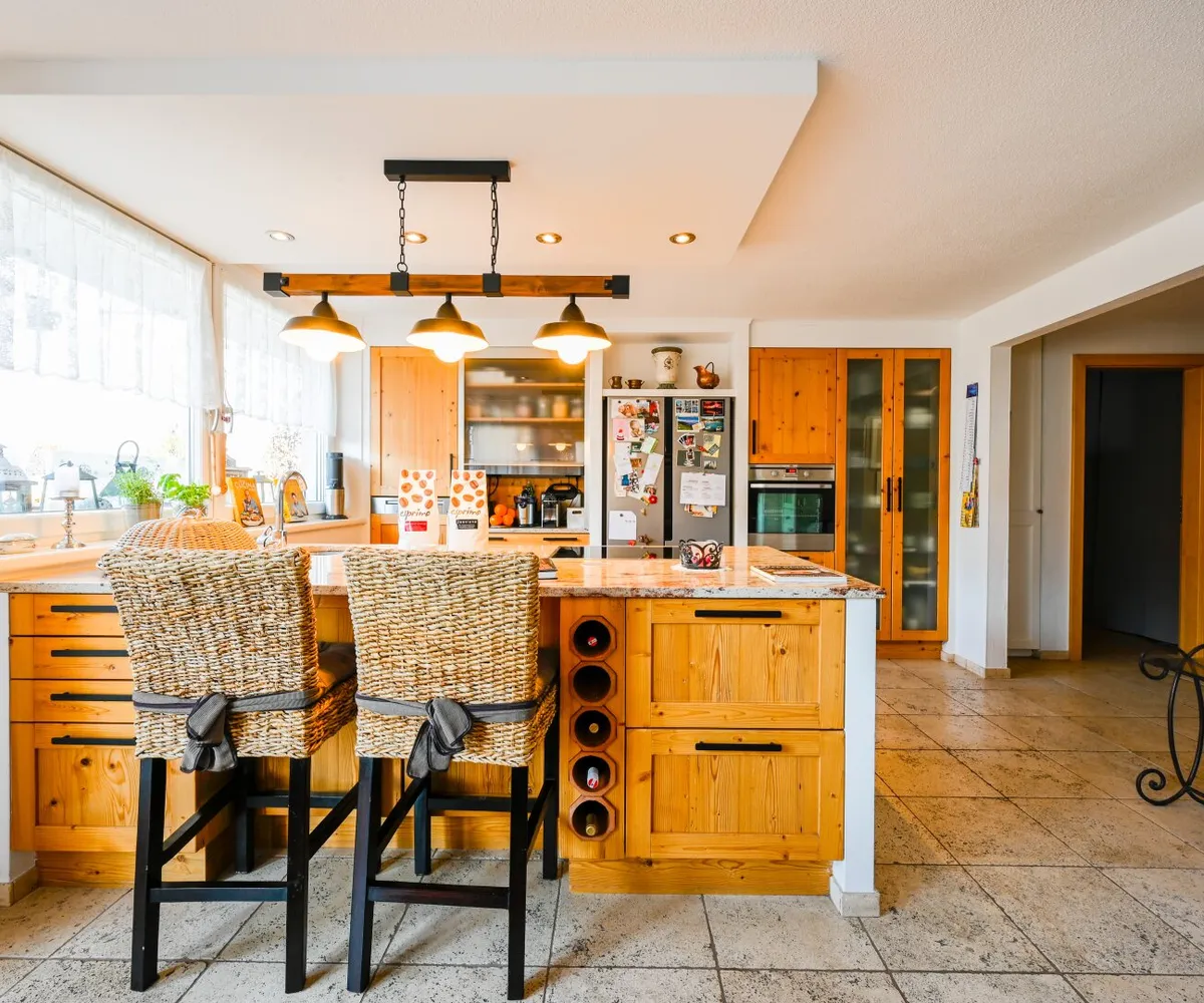 Die offene Küche ist funktional und zeitlos gestaltet und fügt sich nahtlos in den Wohnbereich ein. Sie bietet ausreichend Arbeitsfläche sowie Stauraum und macht gemeinsames Kochen zu einem besonderen Erlebnis.