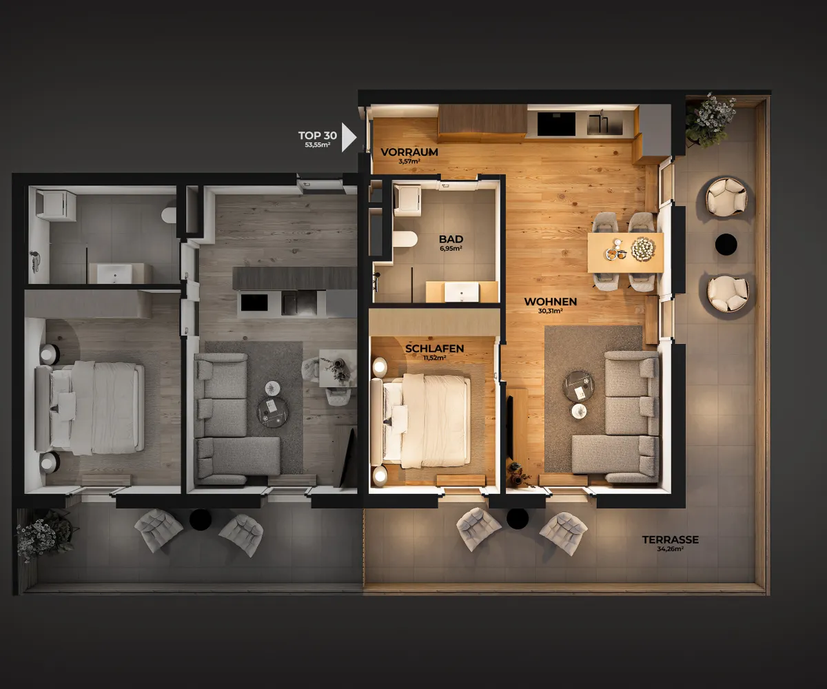 Das nachhaltige Neubauprojekt all.in99 Wörgl überzeugt durch moderne Massivholzbauweise, ökologische Materialien und zukunftsweisende Technik. Barrierefreie Zugänge, Photovoltaik-Contracting sowie eine Fußbodenheizung über Fernwärme sorgen für nachhaltigen Wohnkomfort und niedrige Energiekosten. Ein gemeinschaftlicher Fahrradraum und ein Kinderspielplatz steigern den Lebenswert.