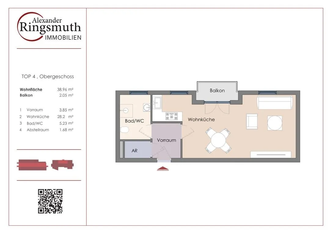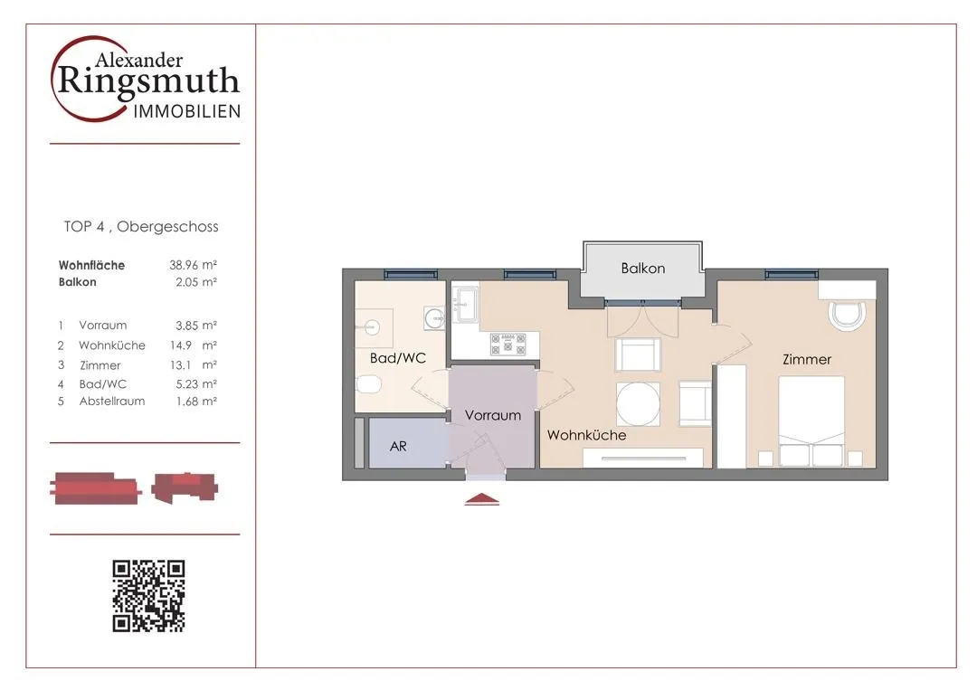 Auf einer Wohnfläche von ca. 38,96 m² erwartet Sie folgende Raumaufteilung:
