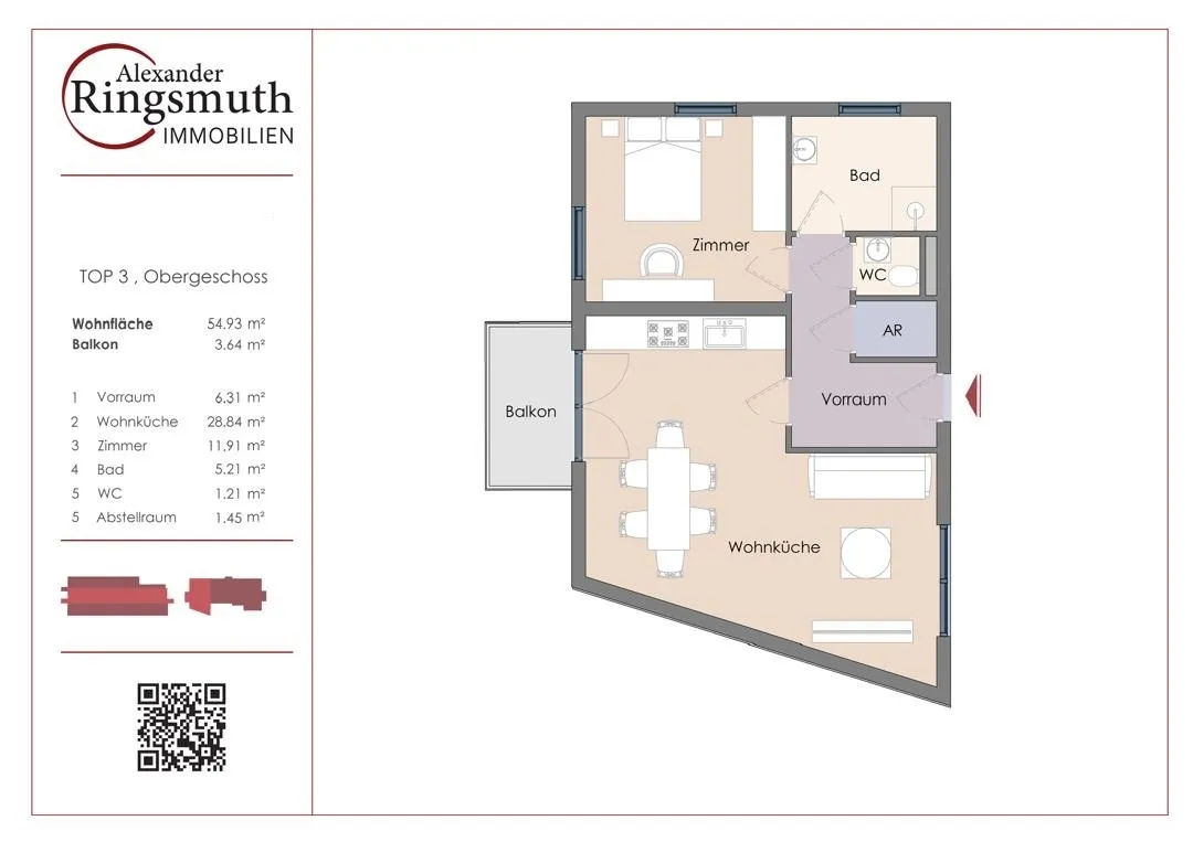 Auf einer Wohnfläche von ca. 54,93 m² erwartet Sie folgende Raumaufteilung: