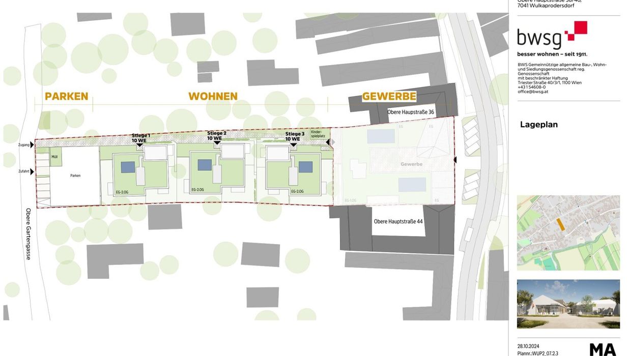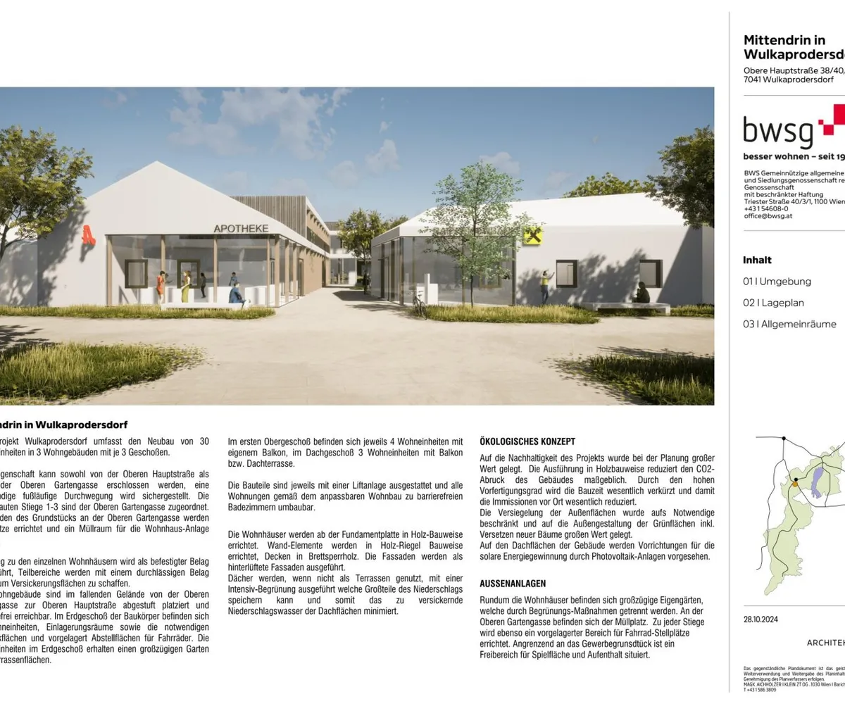 Mitten in Wulkaprodersdorf baut die BWS-Gruppe 30 Wohnungen und ein Gewerbezentrum.
