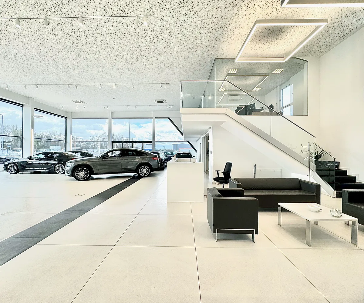 Der riesige Showroom in Einklang mit den verglasten Fronten sorgt für eine exzellente Atmosphäre um die Fahrzeuge ansprechend in Szene zu setzen. Auch exklusiven Events mit Kunden oder Sonder-Vorstellungen neuer Fahrzeuge steht hier nichts im Wege!