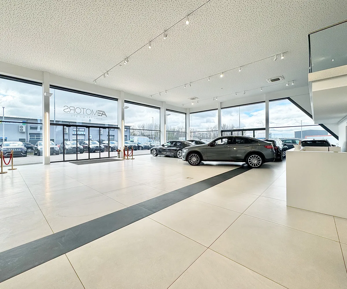 Der riesige Showroom in Einklang mit den verglasten Fronten sorgt für eine exzellente Atmosphäre um die Fahrzeuge ansprechend in Szene zu setzen. Auch exklusiven Events mit Kunden oder Sonder-Vorstellungen neuer Fahrzeuge steht hier nichts im Wege!
