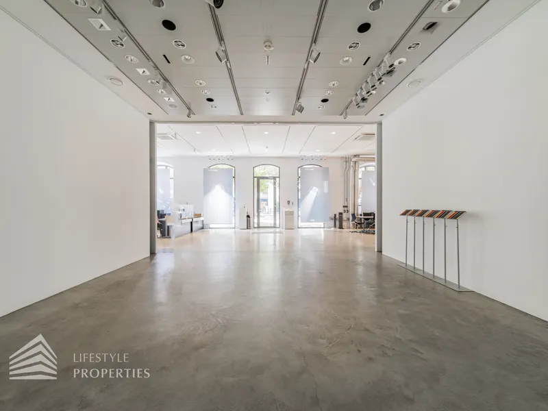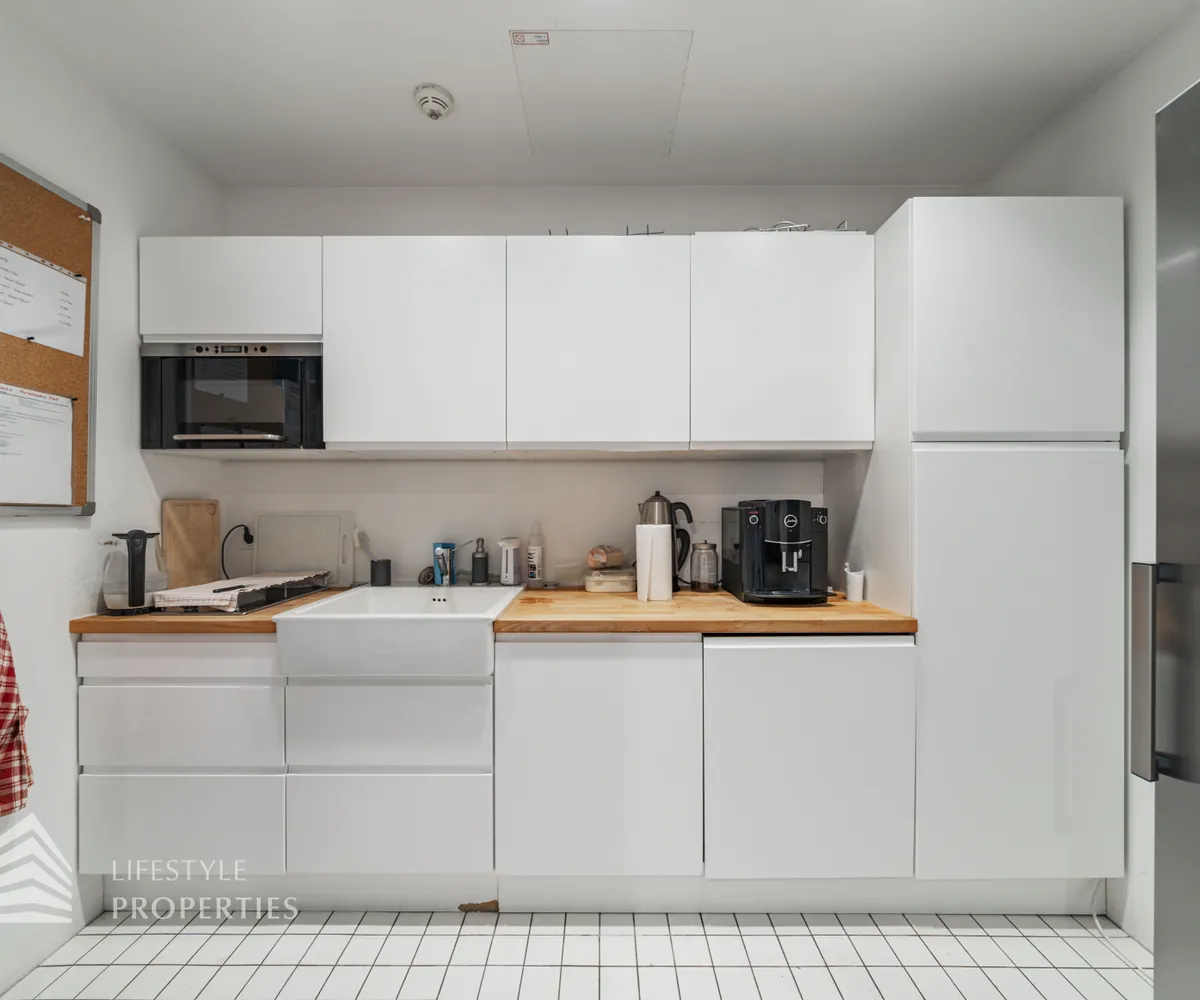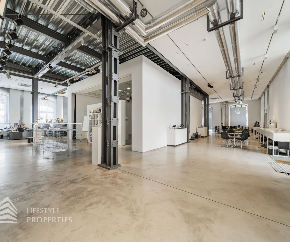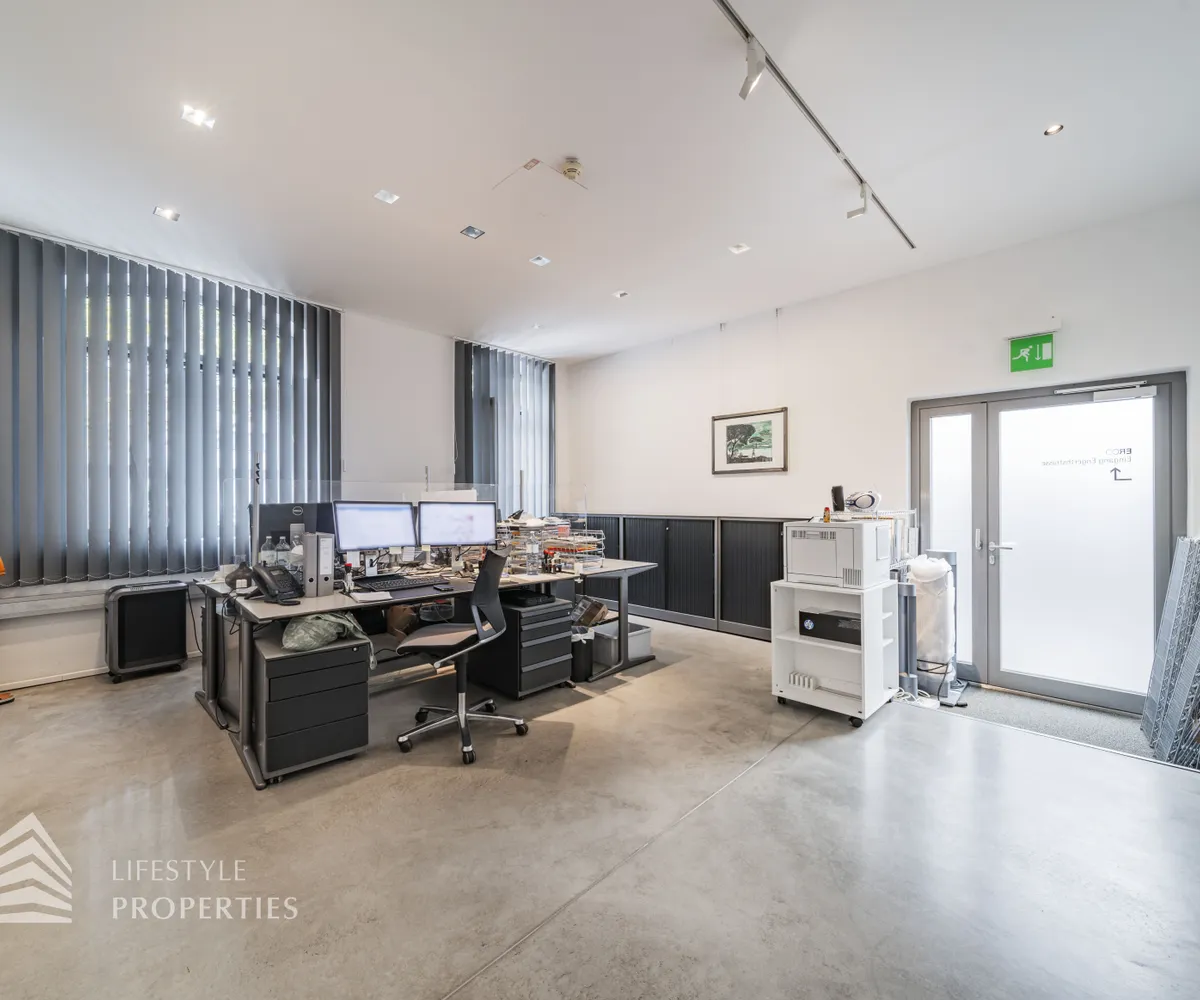 Die Bürofläche zeichnet sich durch die offene Raumgestaltung aus. Viele große Fenster versorgen die Räumlichkeiten mit viel Licht und schaffen eine angenehme Arbeitsatmosphäre. Die Küche ist mit modernen Geräten ausgestattet und verfügt über ausreichend Stauraum.