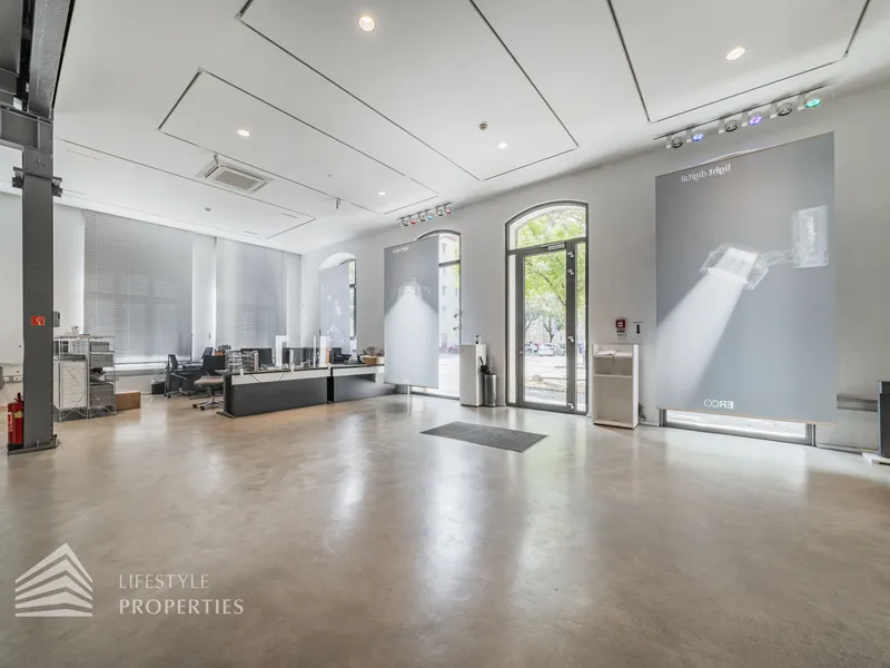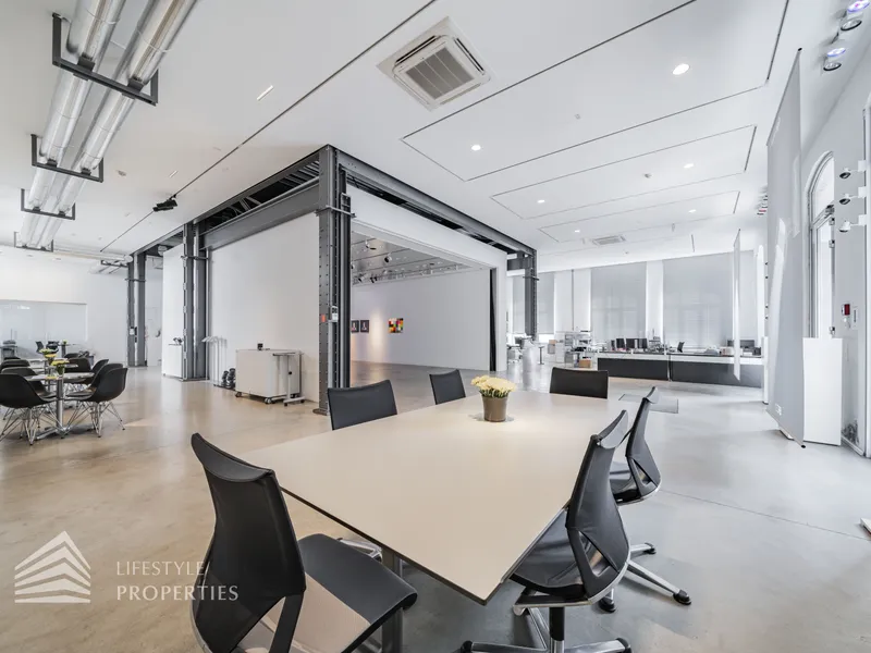 Die Bürofläche zeichnet sich durch die offene Raumgestaltung aus. Viele große Fenster versorgen die Räumlichkeiten mit viel Licht und schaffen eine angenehme Arbeitsatmosphäre. Die Küche ist mit modernen Geräten ausgestattet und verfügt über ausreichend Stauraum.