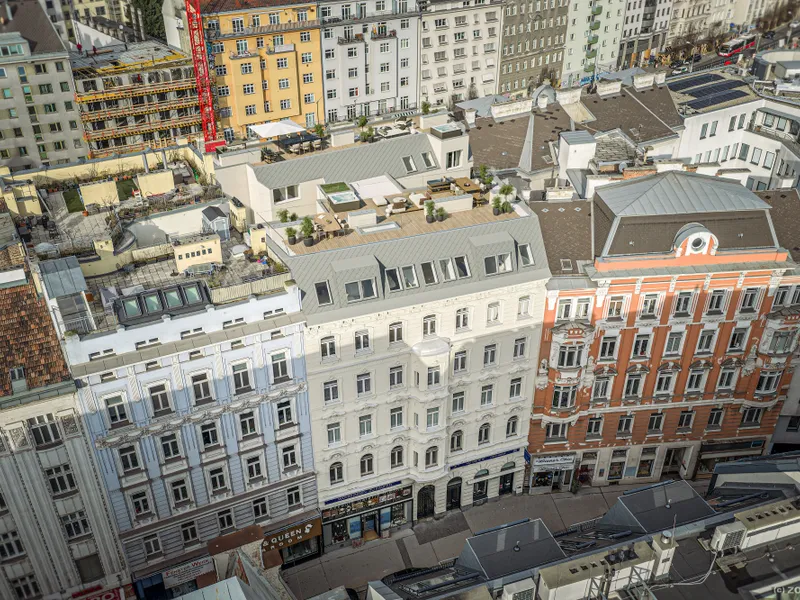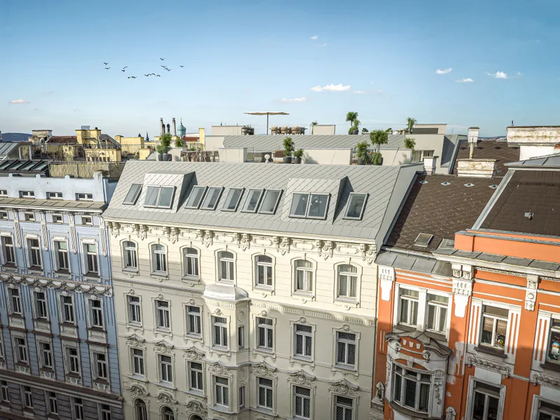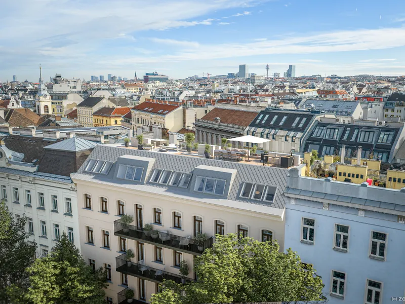 Im Dachgeschoß sind 2 Wohneinheiten mit großen Terrassen, Balkonen und Dachterrassen geplant.