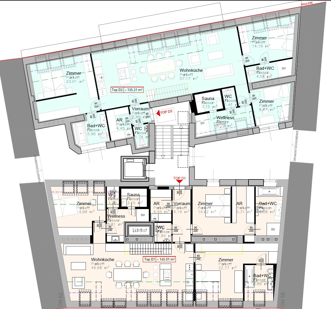 - Top D1: 4-Zimmer Wohnung mit ca. 145,01 m² und ca. 95,45 m² Terrasse.