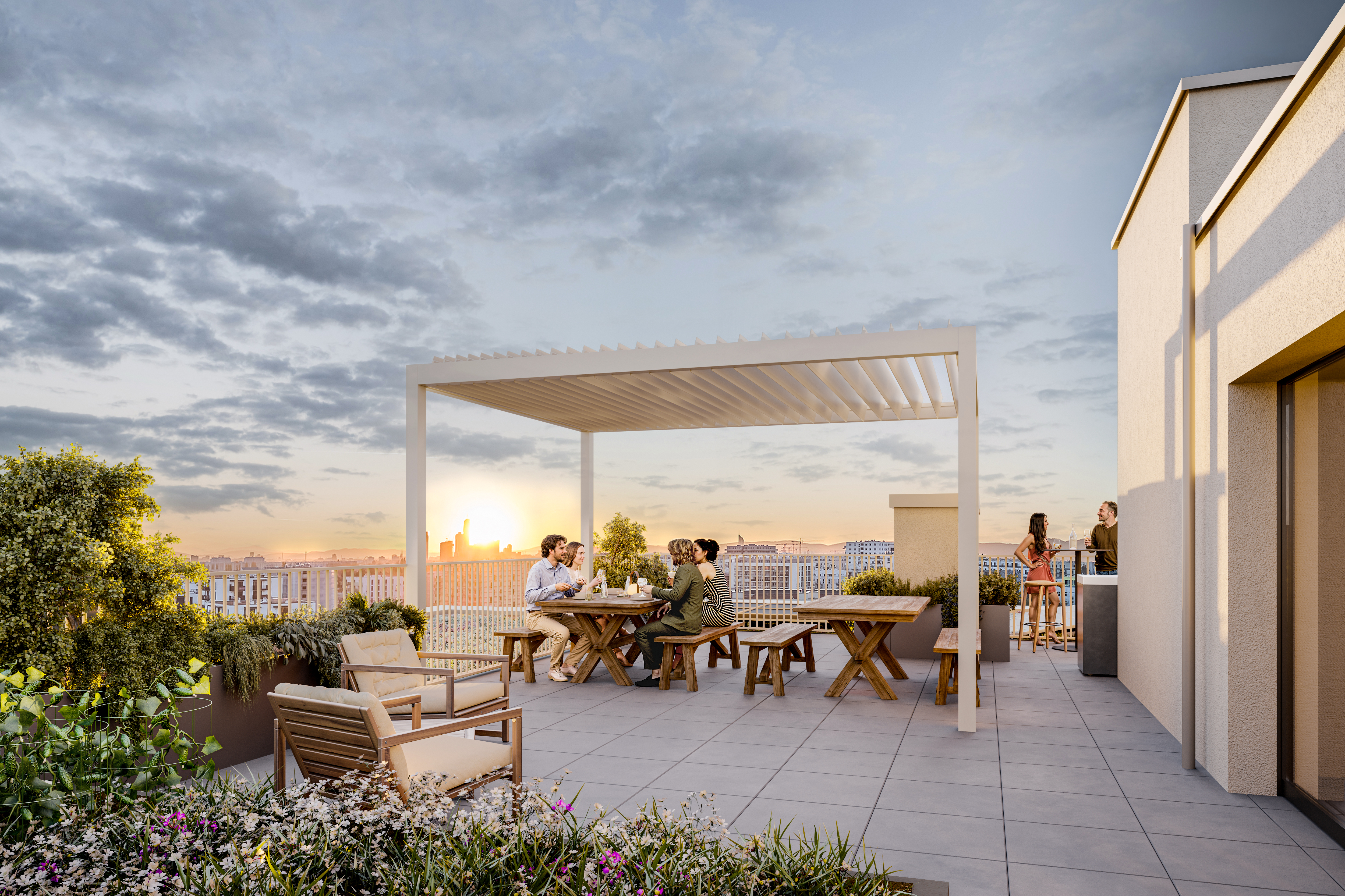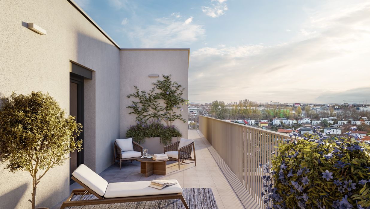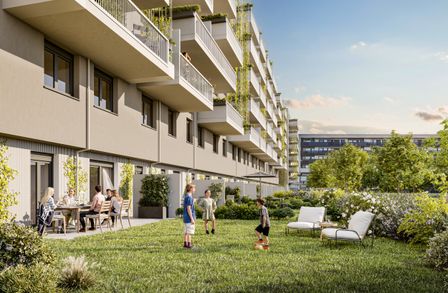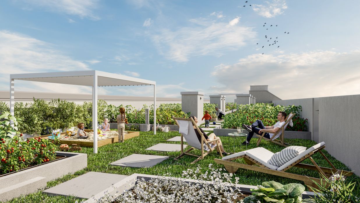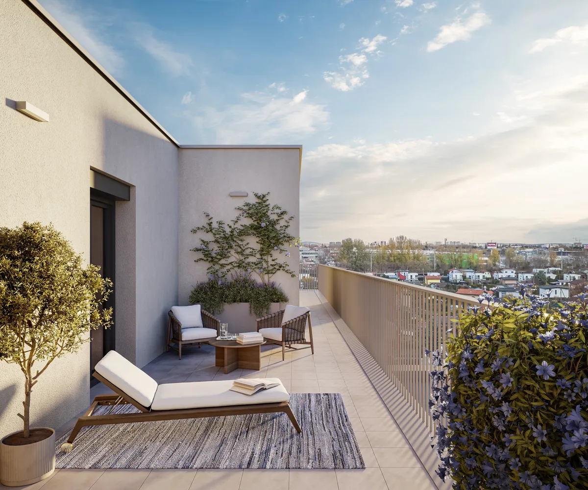 Großzügige Balkone und Terrassen mit integrierten Pflanzmöglichkeiten erweitern den Wohnraum ins Freie und laden zur Gestaltung persönlicher Grünoasen ein. Bodentiefe Fenster bringen viel Tageslicht in die Wohnungen und schaffen fließende Übergänge zwischen Innen- und Außenbereich. Zusätzlich stehen auf den Dachflächen individuell erwerbbare Garten- und Hochbeete zur Verfügung – ideal für alle, die Freude an urbanem Gärtnern haben. Gemeinschaftliche Freiflächen mit Sitzmöglichkeiten und Pergola bieten Platz für Erholung und Begegnung mit beeindruckendem Ausblick. Ein begrünter Innenhof mit vielfältigen Spiel- und Aufenthaltsmöglichkeiten ergänzt das Angebot und sorgt für hohe Aufenthaltsqualität direkt im Haus.