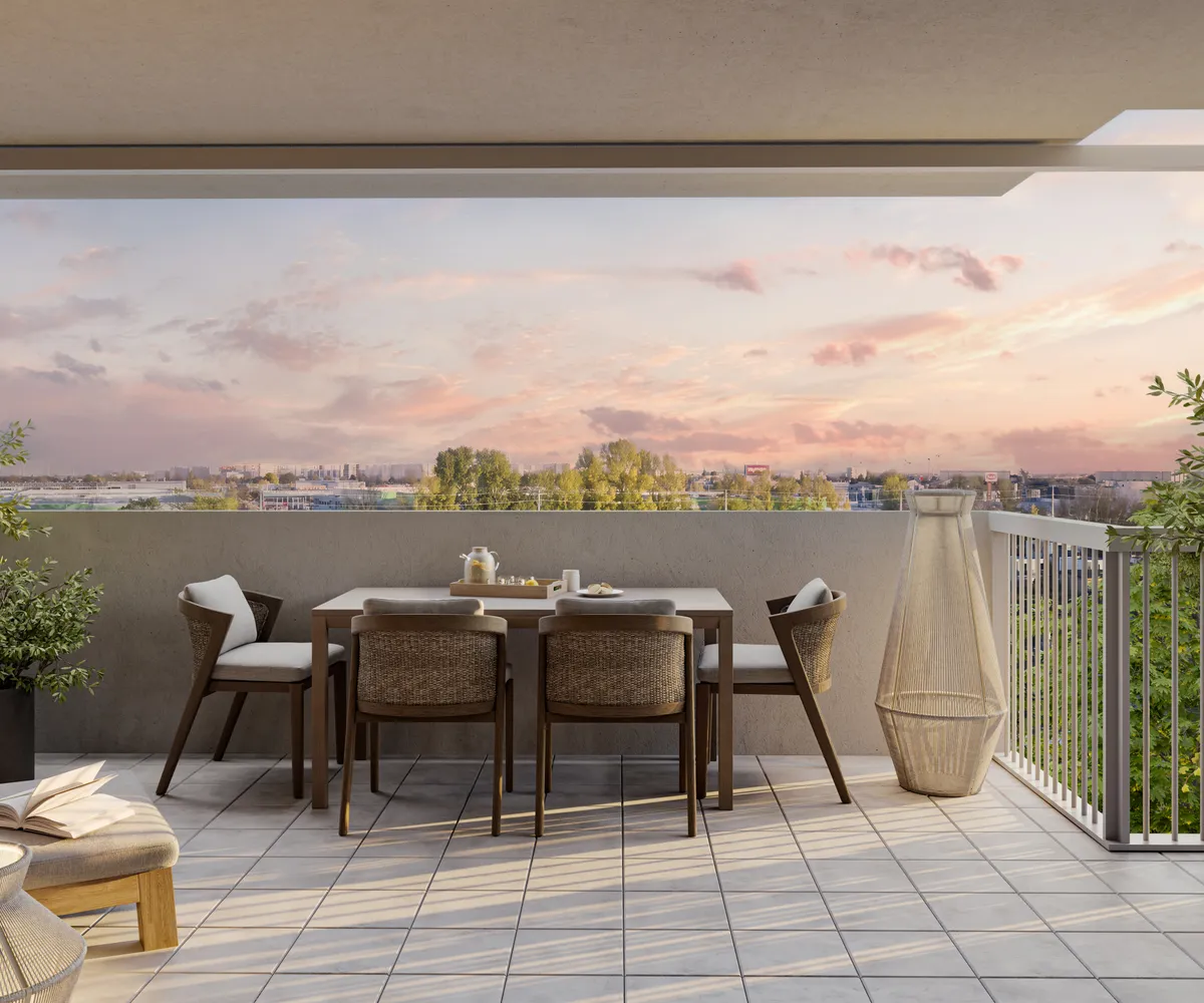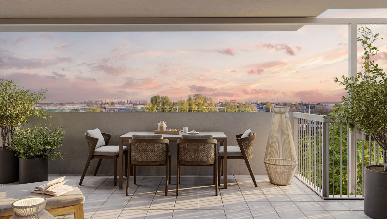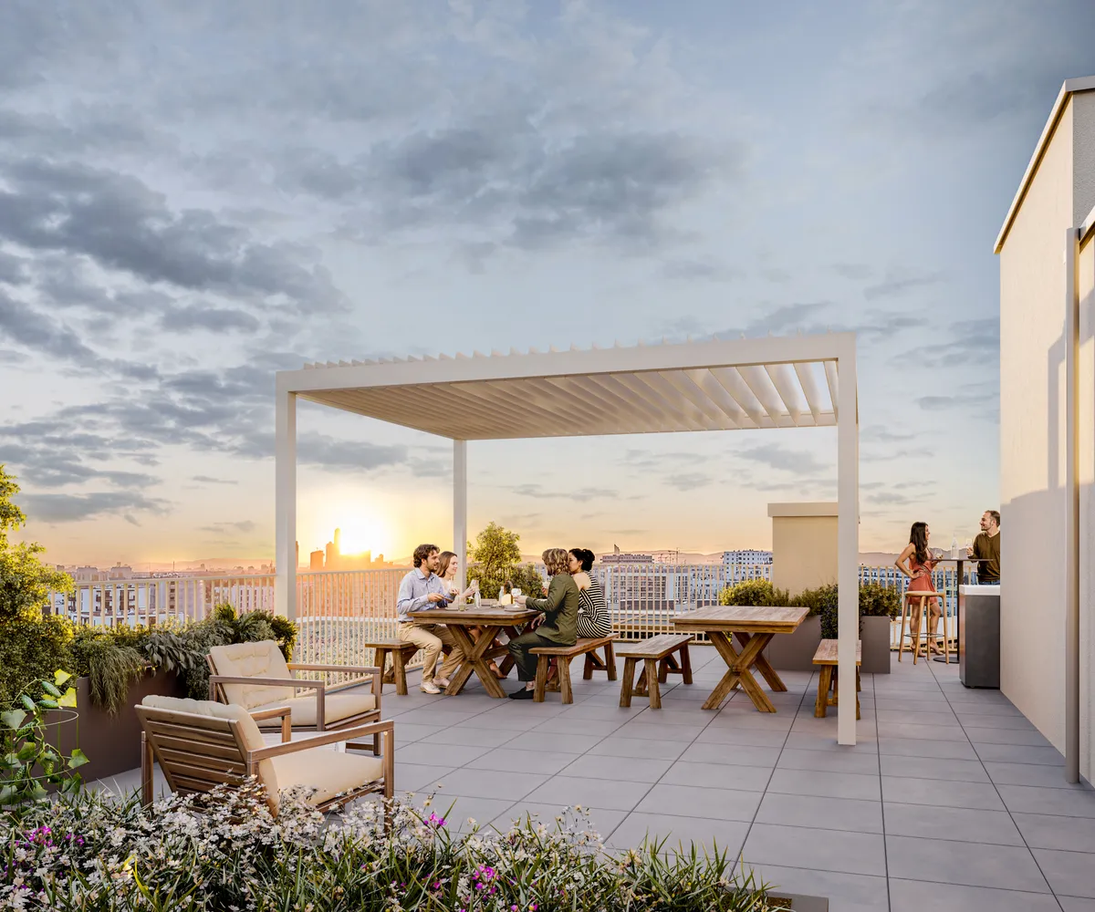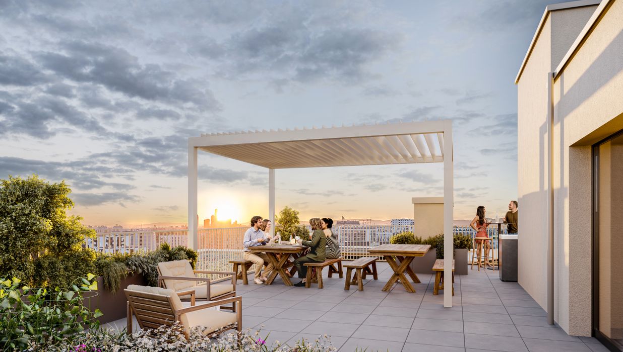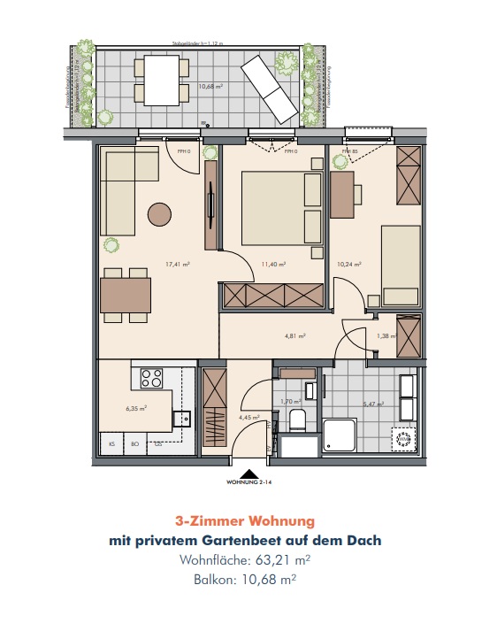 Großzügige Balkone und Terrassen mit integrierten Pflanzmöglichkeiten erweitern den Wohnraum ins Freie und laden zur Gestaltung persönlicher Grünoasen ein. Bodentiefe Fenster bringen viel Tageslicht in die Wohnungen und schaffen fließende Übergänge zwischen Innen- und Außenbereich. Zusätzlich stehen auf den Dachflächen individuell erwerbbare Garten- und Hochbeete zur Verfügung – ideal für alle, die Freude an urbanem Gärtnern haben. Gemeinschaftliche Freiflächen mit Sitzmöglichkeiten und Pergola bieten Platz für Erholung und Begegnung mit beeindruckendem Ausblick. Ein begrünter Innenhof mit vielfältigen Spiel- und Aufenthaltsmöglichkeiten ergänzt das Angebot und sorgt für hohe Aufenthaltsqualität direkt im Haus.
