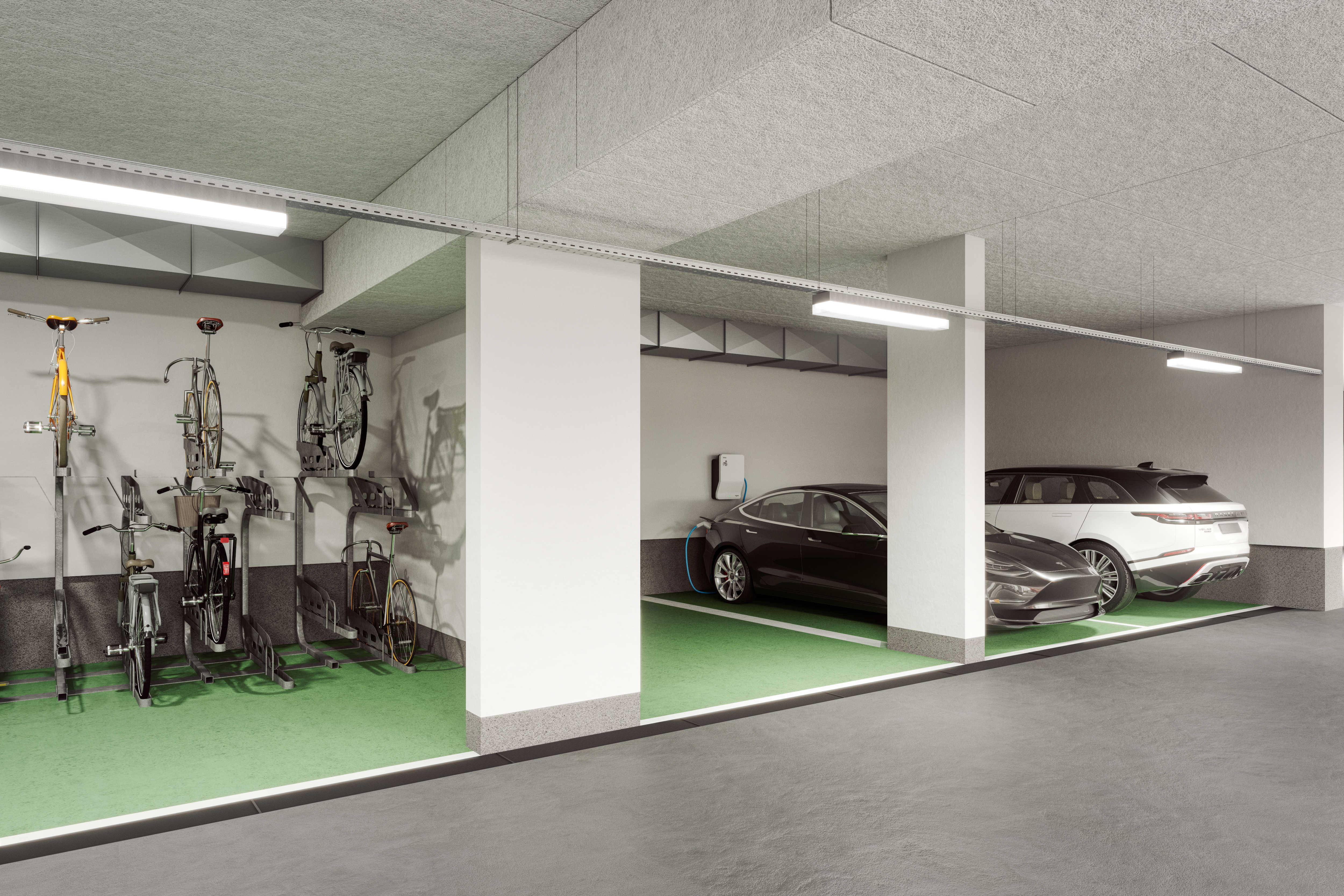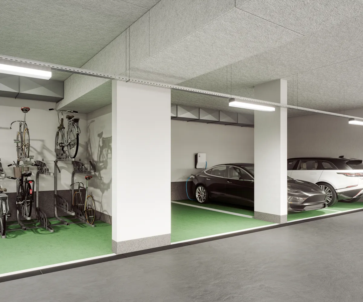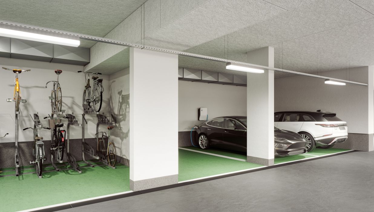 • Tiefgarage mit ca. 100 Stellplätzen, alle E-Mobilität-vorbereitet