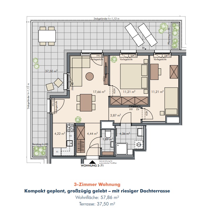 Top 2-71/ DG / 57,9 m² WNF / 37,5 m² Freifläche / 435.000 € Netto KP / 489.000 € Brutto KP