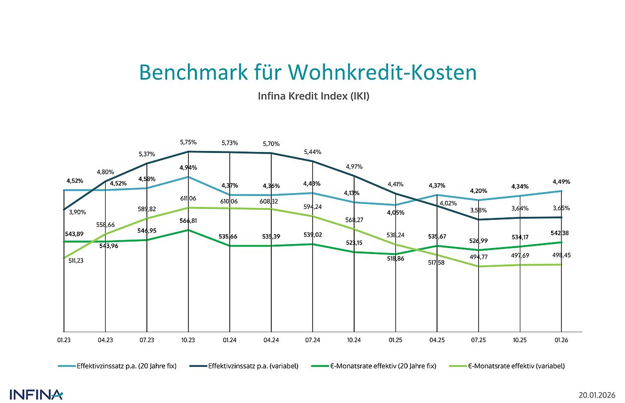 Grundlage für den IKI sind die Daten von 12 regionalen und überregionalen Kreditinstituten, aus denen die Höhe der monatlichen Kreditraten abgeleitet wird. Details sind dem Factsheet zu entnehmen. Der Infina-Kreditindex wird quartalsweise jeweils im ersten Monat eines Quartals publiziert. Der nächste Infina-Kreditindex wird im April 2026 veröffentlicht.