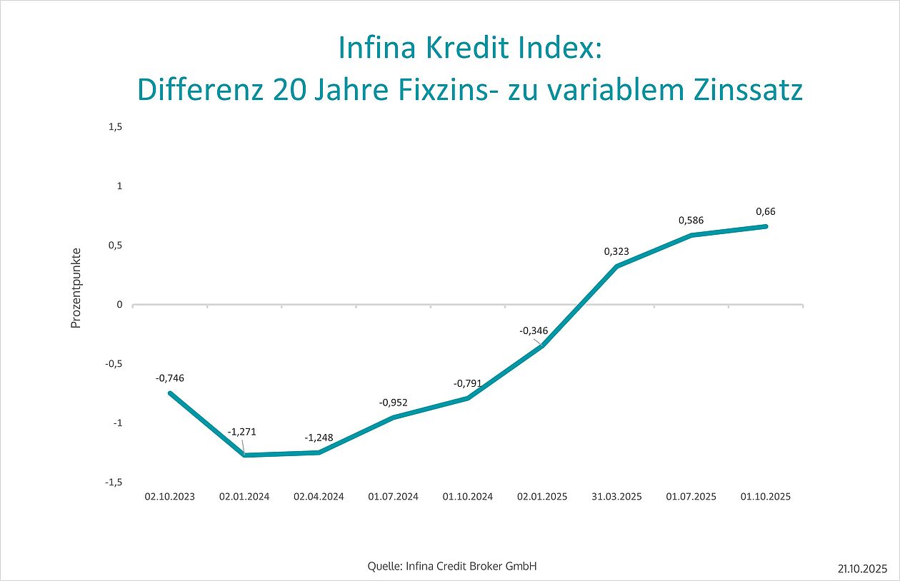 Erstmals seit zwei Jahren sind die Nominalzinsen für variabel verzinste Kredite gestiegen. Im Einklang mit dem leichten Anstieg des 3-Monats-Euribors erhöhten sich die variablen Kreditzinsen laut Infina Kredit Index (IKI) vom 1. Juli bis zum 1. Oktober 2025 um 5,4 Basispunkte auf 3,142 %.