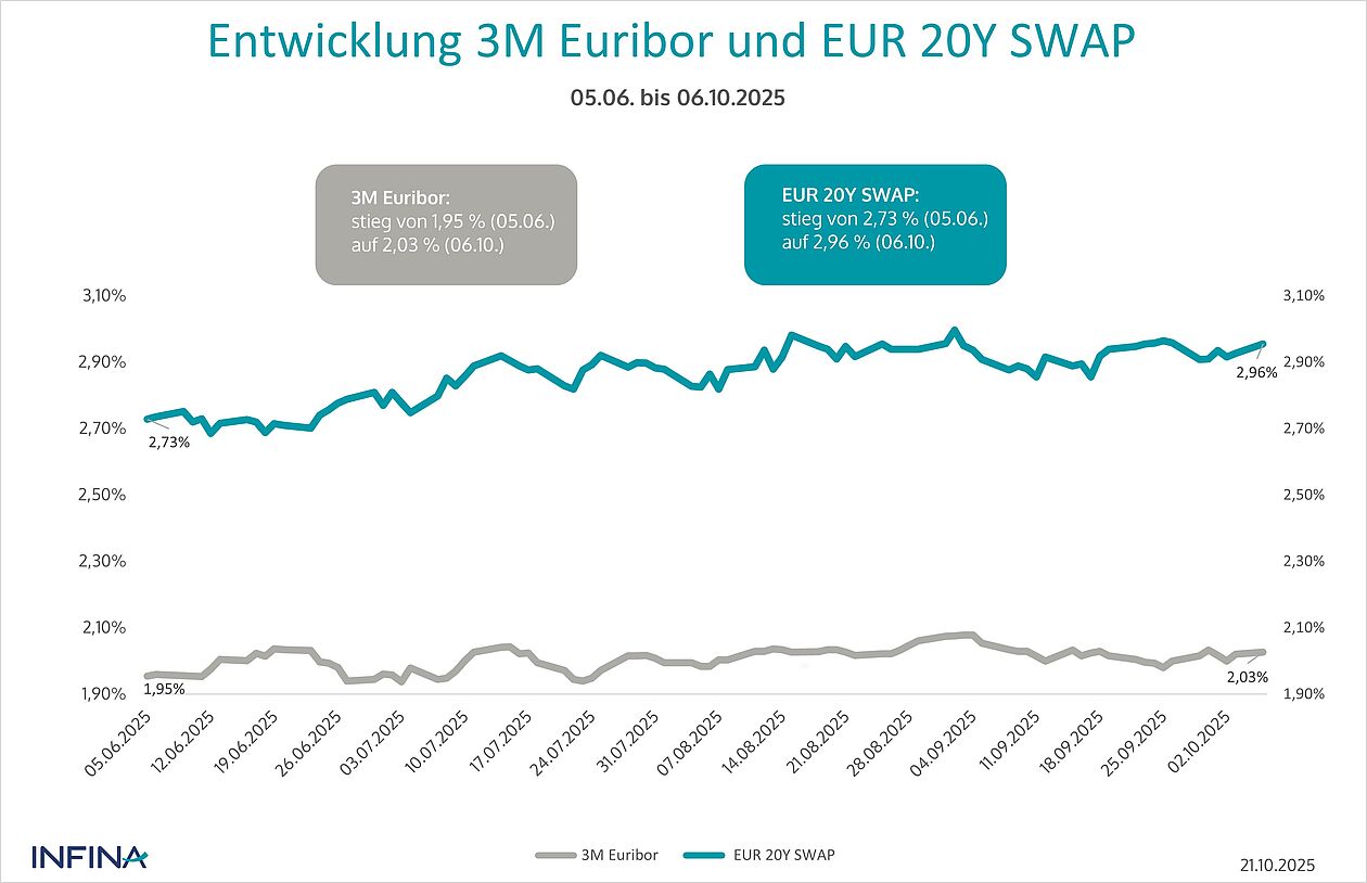 Bis zur jüngsten Leitzinssenkung am 5. Juni 2025 hatte der 3-Monats-Euribor die bevorstehenden Schritte der EZB regelmäßig im Vorfeld eingepreist. Seither bewegt sich der Geldmarktzins seitwärts, mit einer leicht steigenden Tendenz. Zwischen dem 5. Juni und 6. Oktober 2025 legte der 3-Monats-Euribor von 1,954 % auf 2,026 % zu.